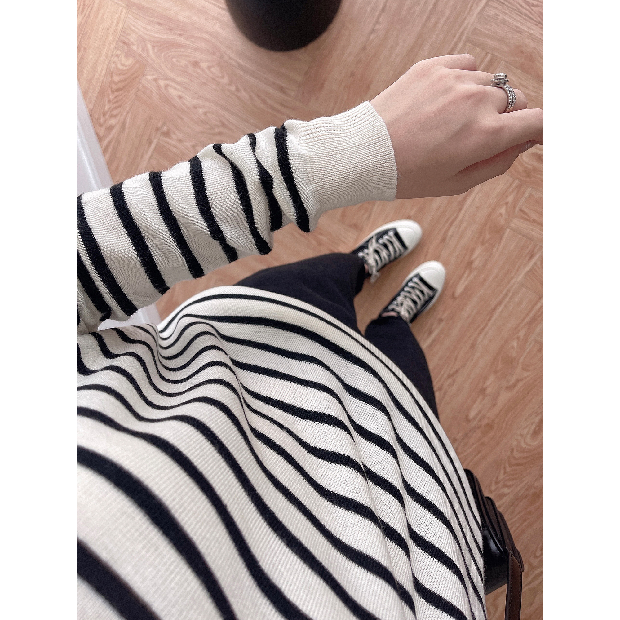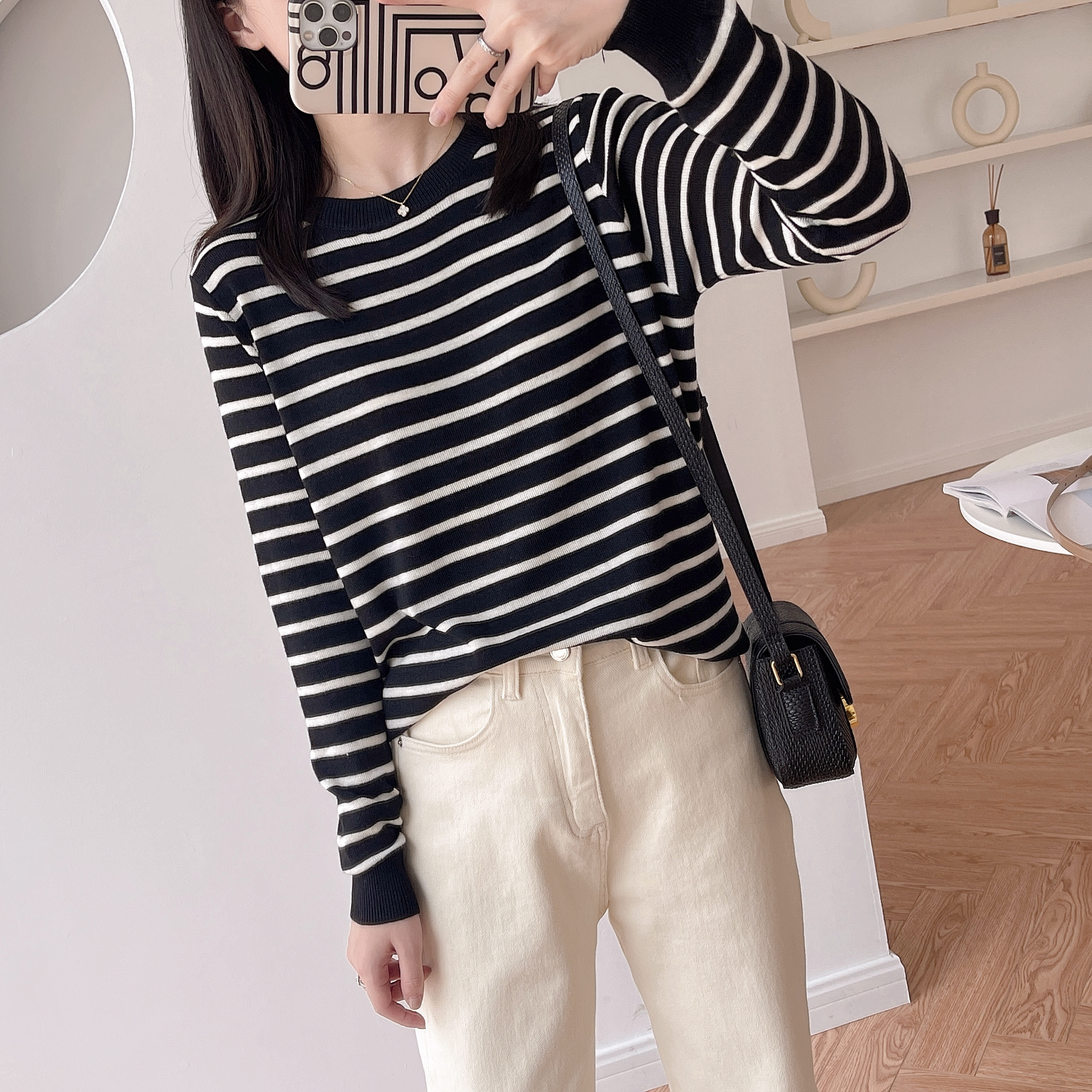 秋季新品简约基础条纹圆领长袖细羊毛针织衫亲肤宽松打底薄款毛衣
