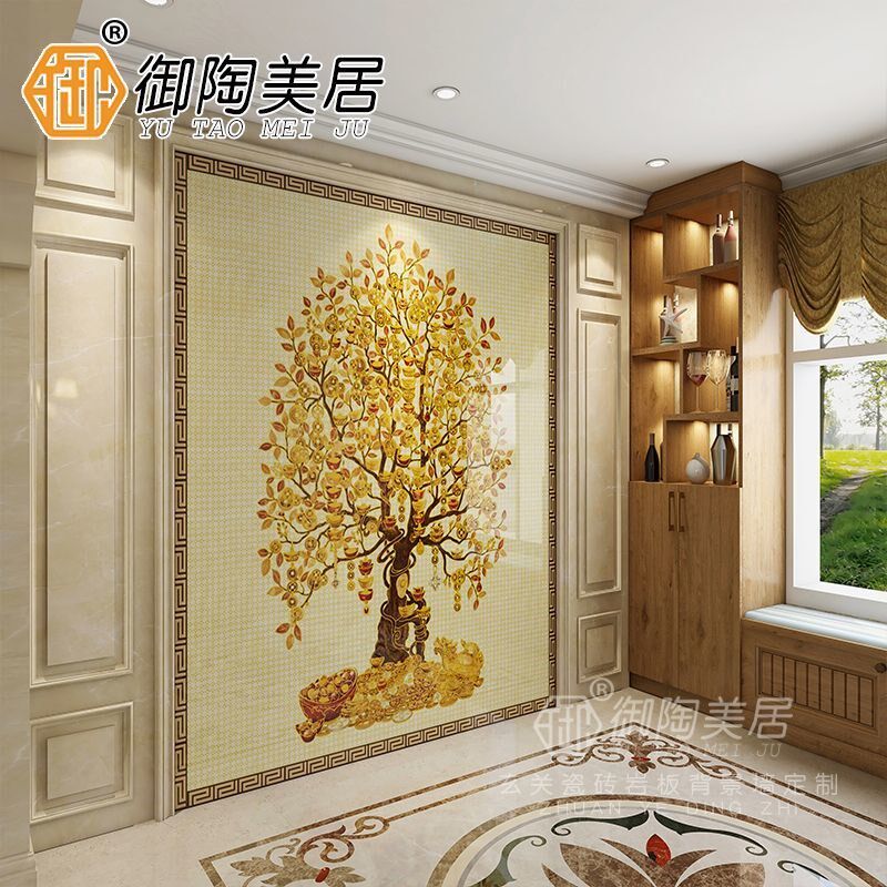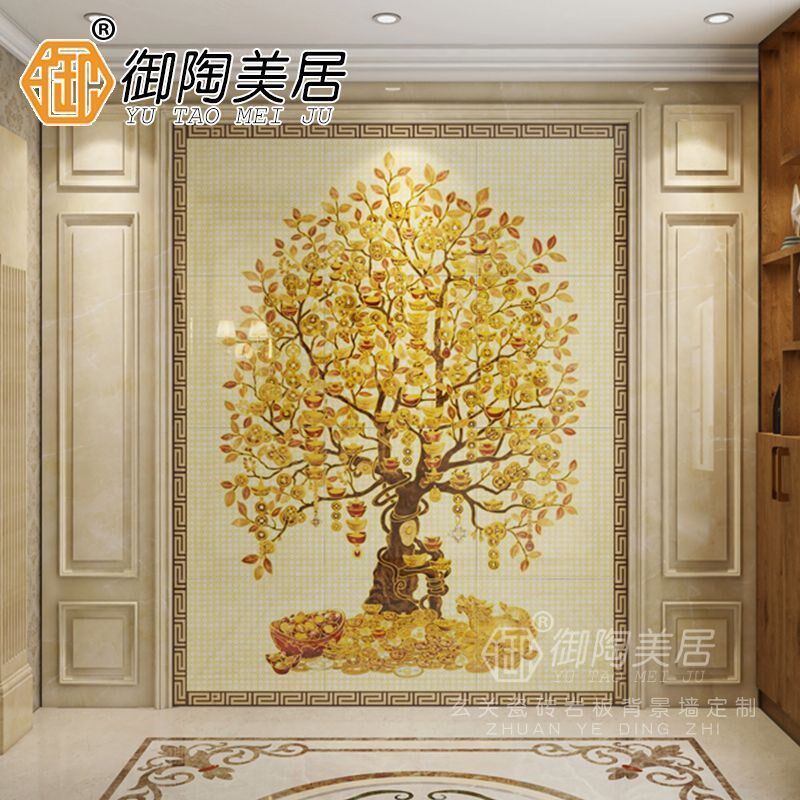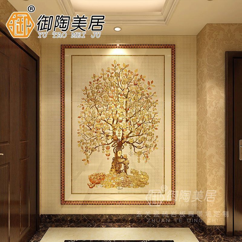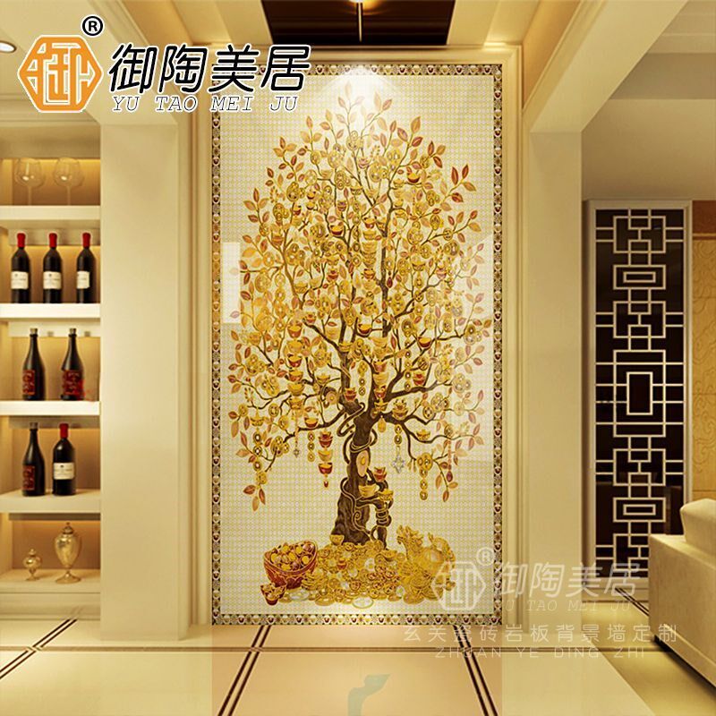 玄关画瓷砖背景墙岩板微晶石大y理石立体雕刻过道中式发财树摇钱