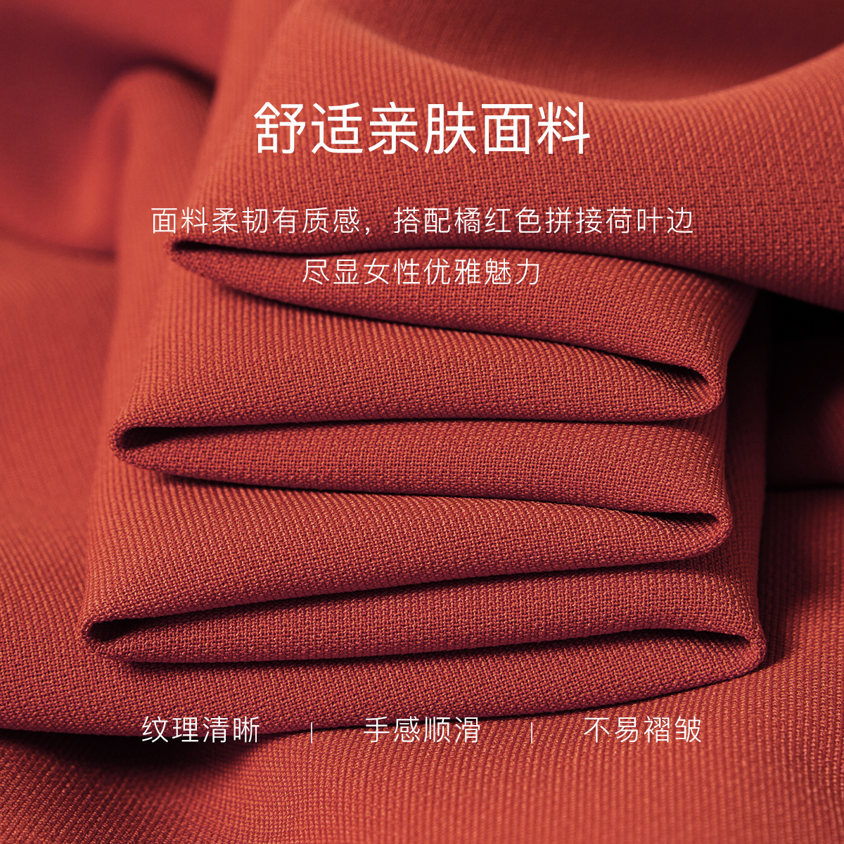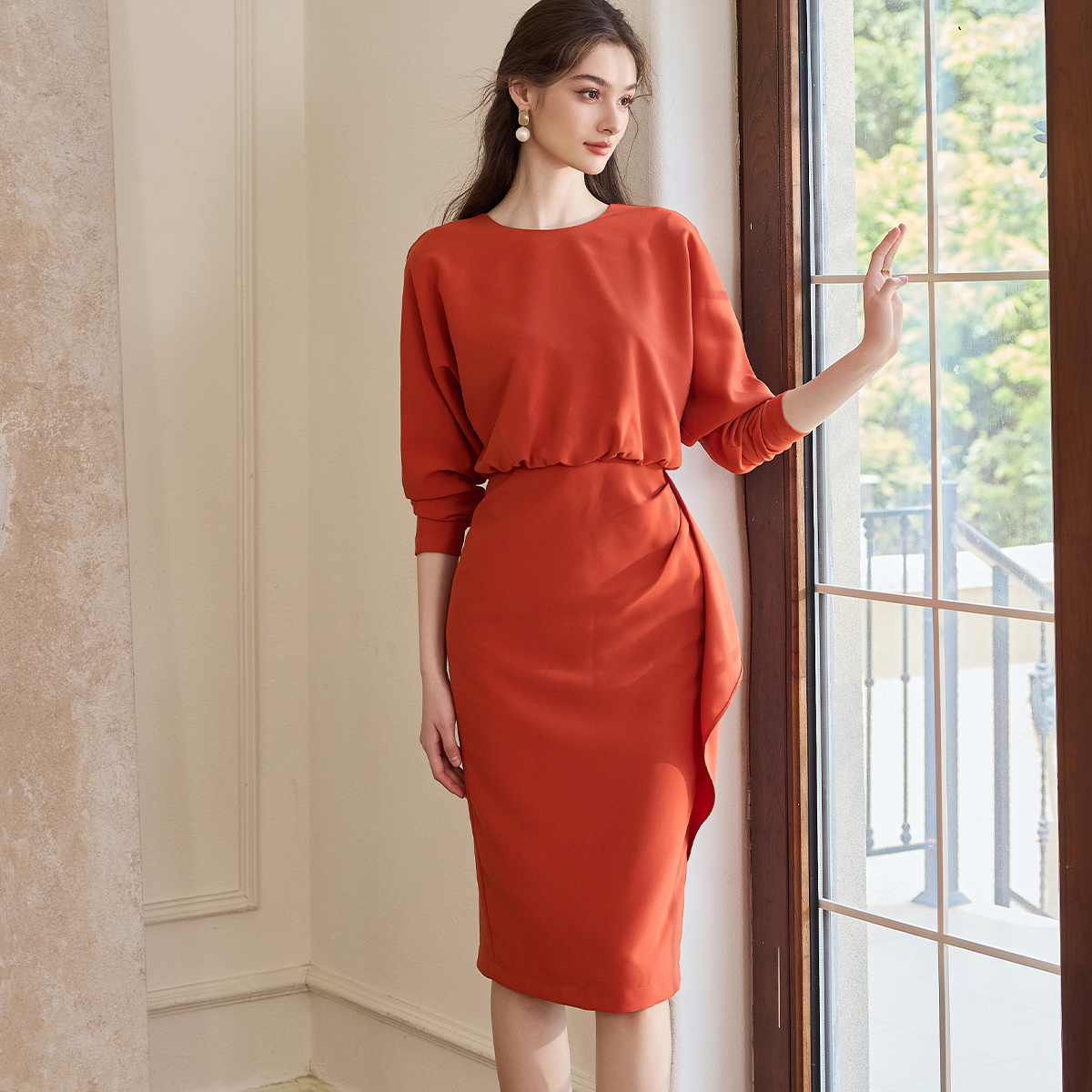 罗衣气质橘红色修身连衣裙2025秋季新款时尚蝙蝠袖包臀裙子10961