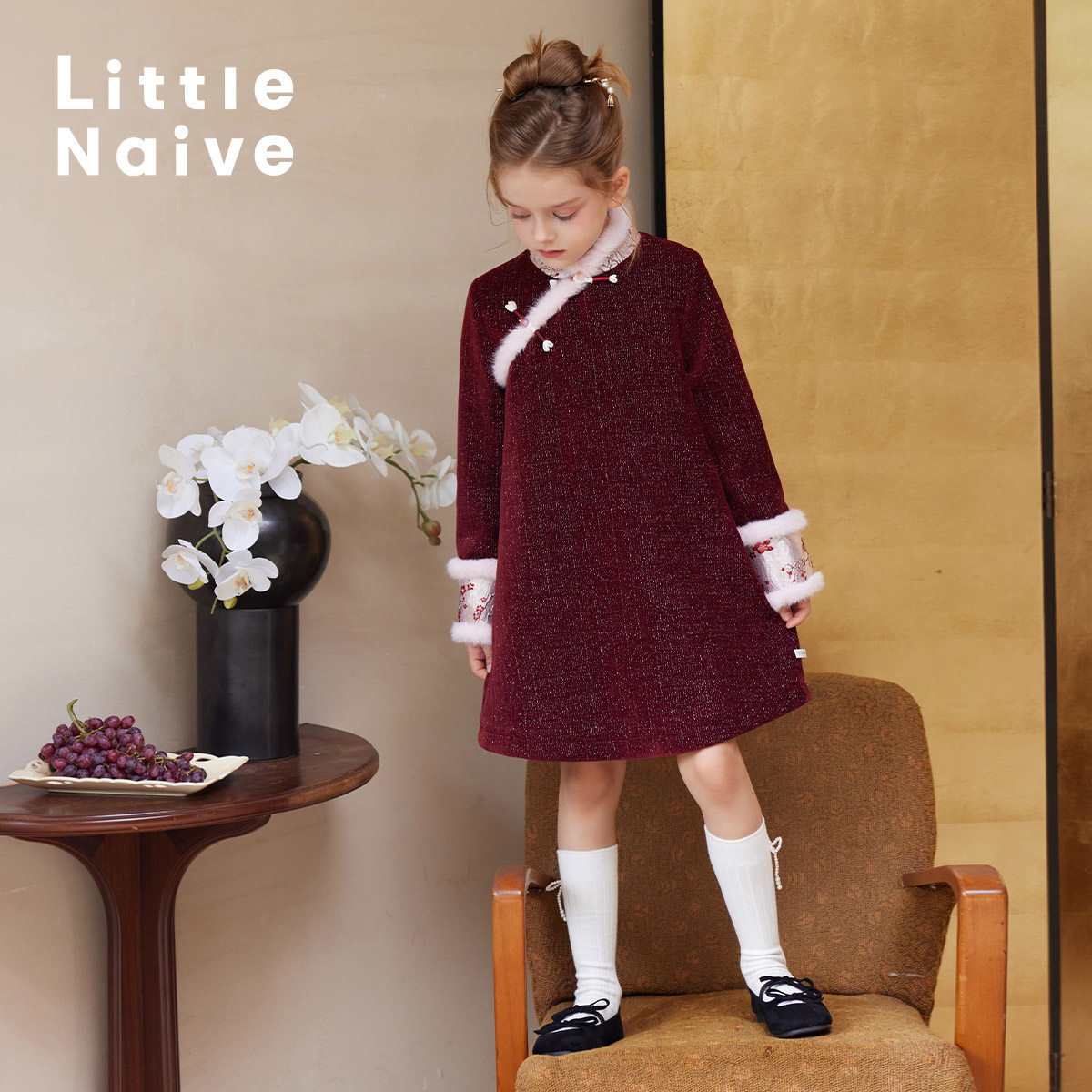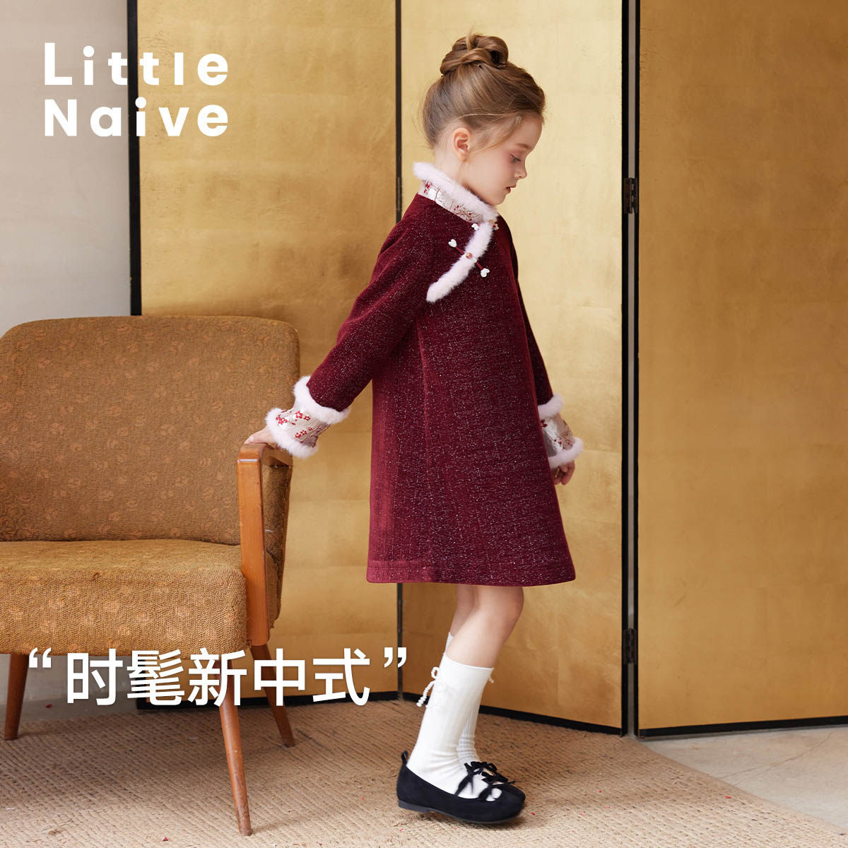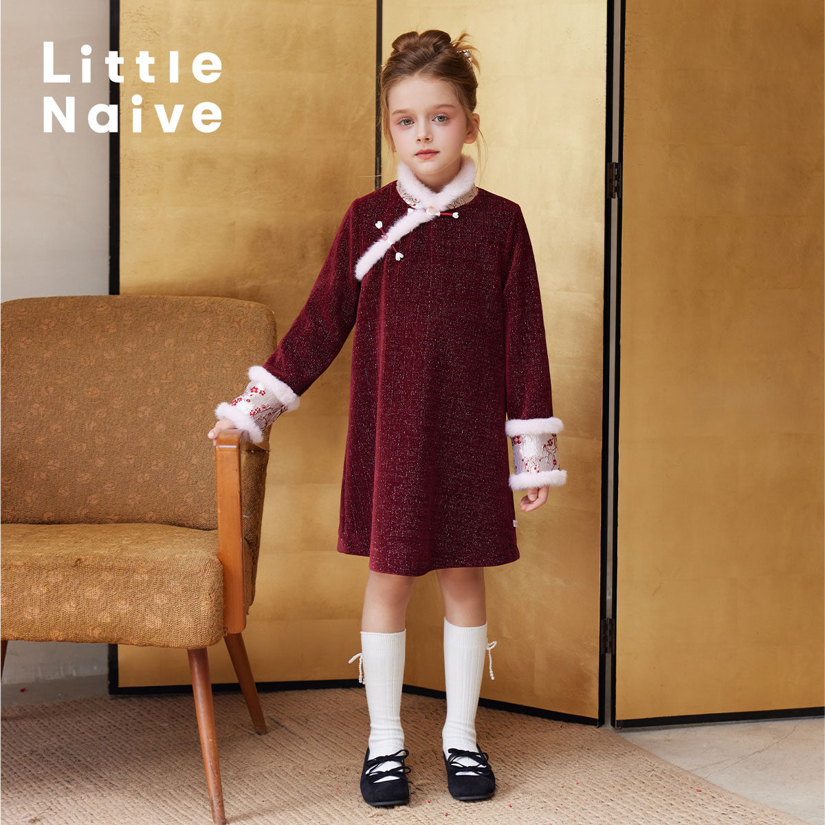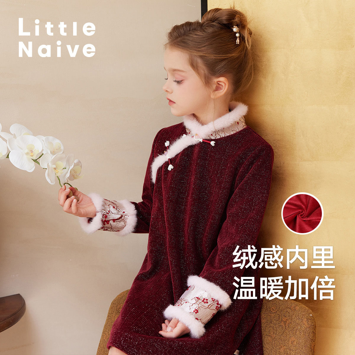 LittleNaive女童中式连衣裙冬款红色加绒裙子儿童新年丝绒裙