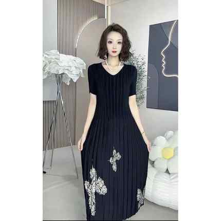 百变弹力三褶皱连衣裙女短袖长款修身显瘦时尚洋气夏季薄款印花裙