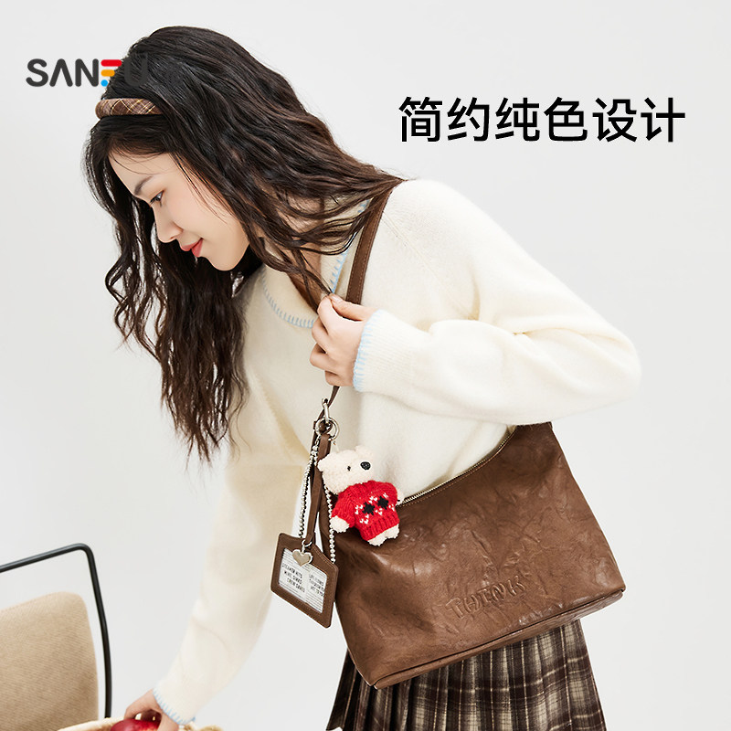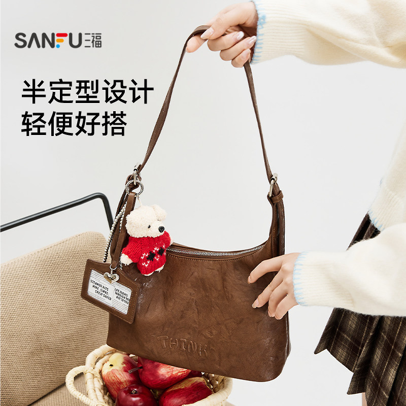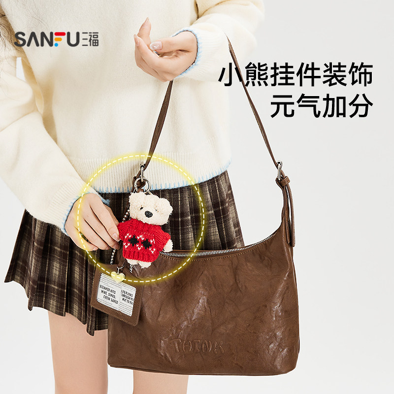 三福挎包秋季学院风纯色小熊挂件hobo包单肩包女包508713