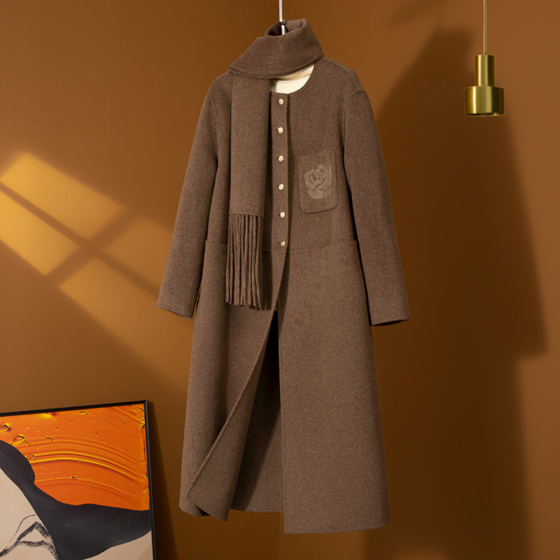 配围巾无领双面羊绒大衣女2025秋冬洋气妈妈装宽松大码羊毛呢外套