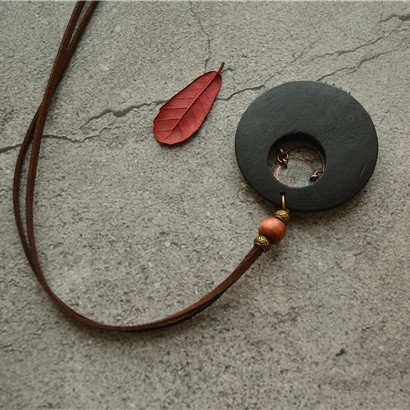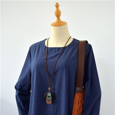 子木。复古民族风女棉麻配饰品铜绿花纹流苏木片长款项链 毛衣链