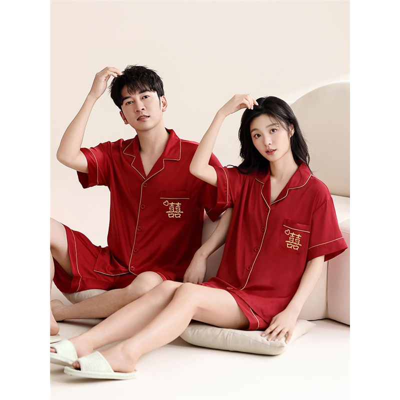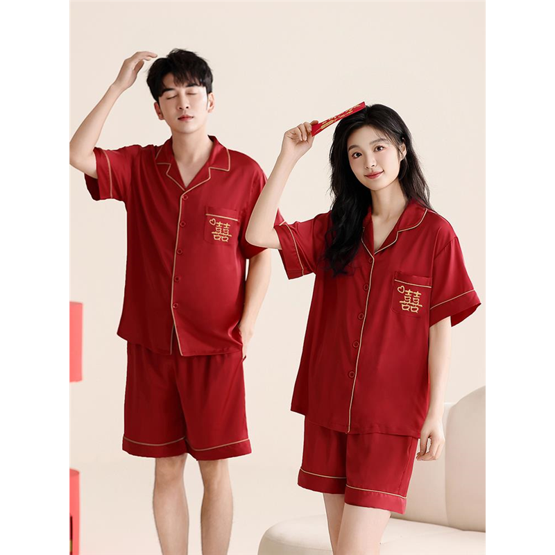 2025新款红色冰丝凉感短袖情侣睡衣夏季男女结婚新婚礼盒套装夏天