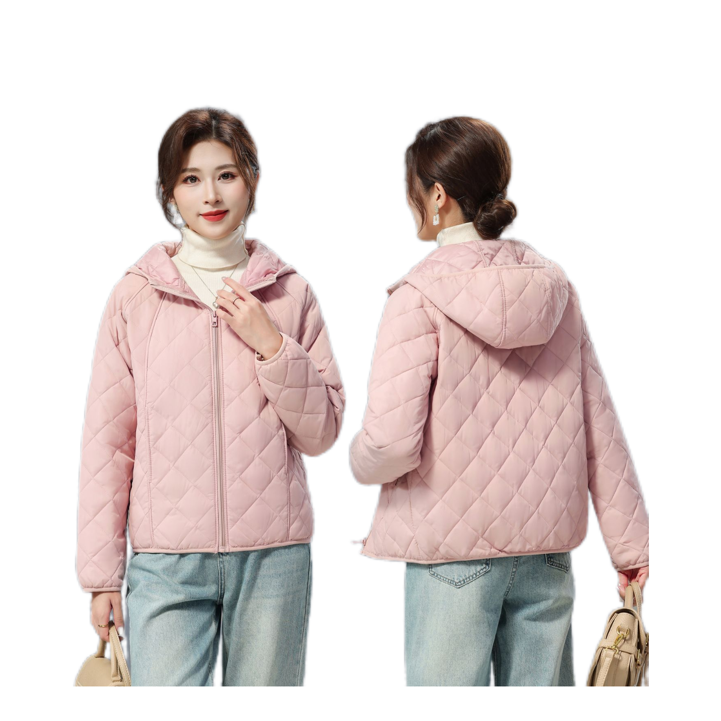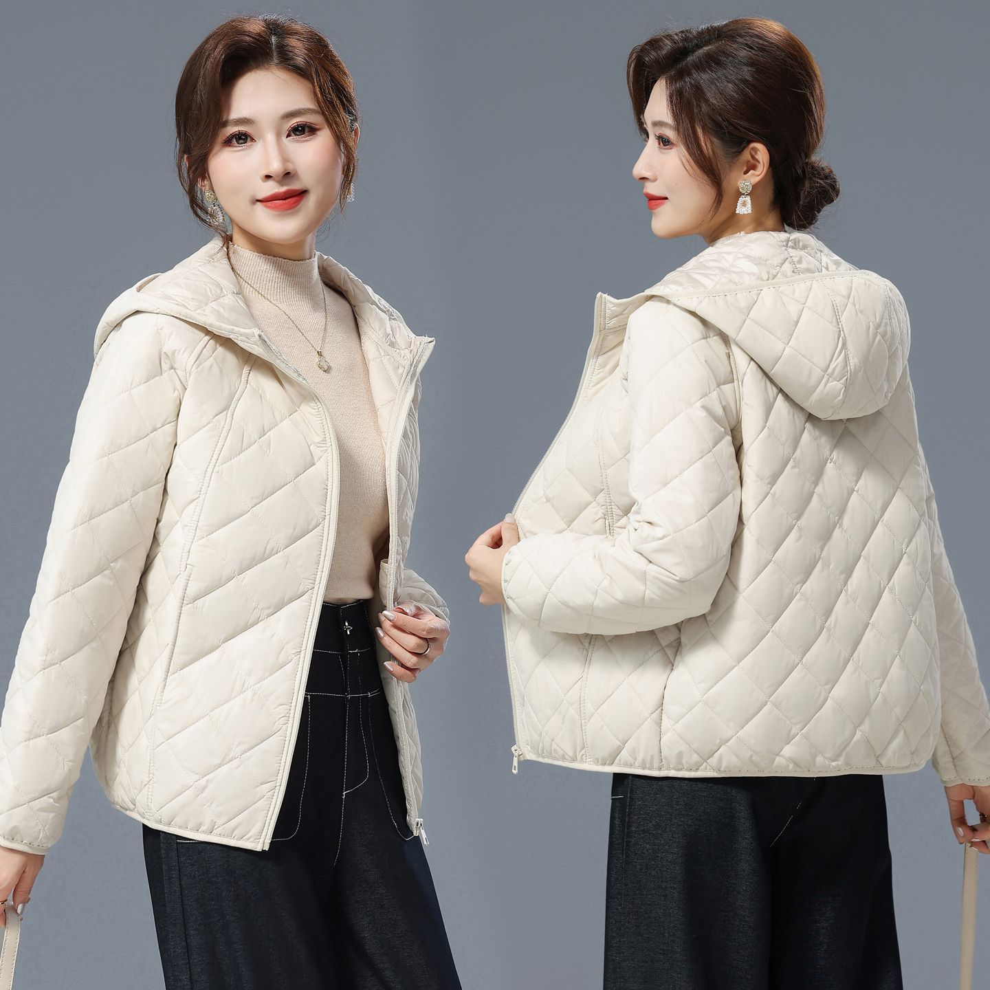 连帽减龄棉服女2025秋冬新款宽松韩版休闲菱形格棉衣纯色棉袄外套