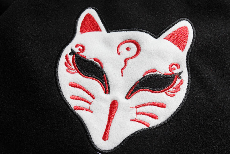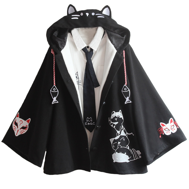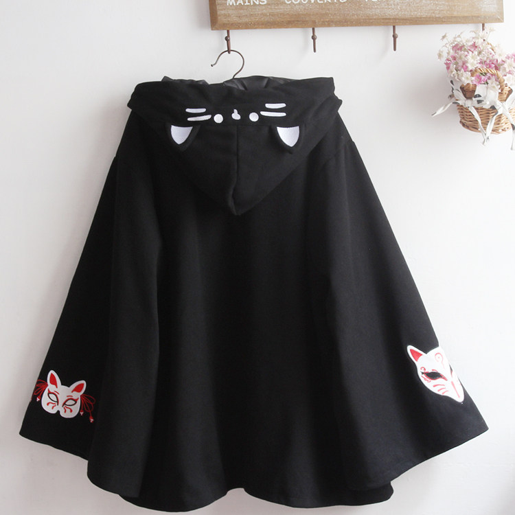 男女同款冬装混搭风斗篷软妹可爱红面具刺绣宽松毛呢大衣黑色外套