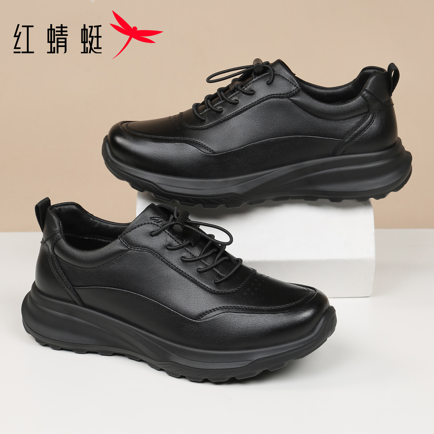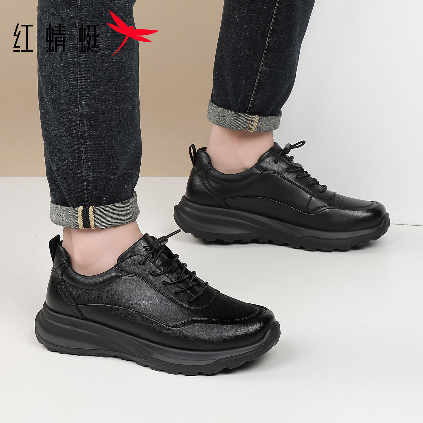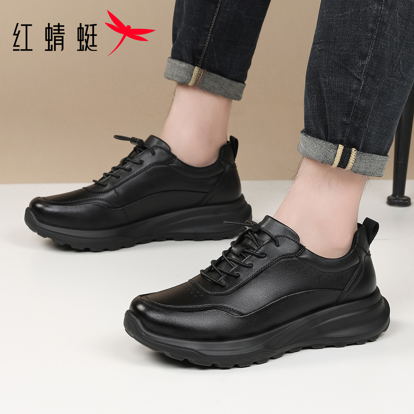 红蜻蜓休闲男鞋2025新款秋季运动皮鞋男款真皮软底厚底黑色旅游鞋