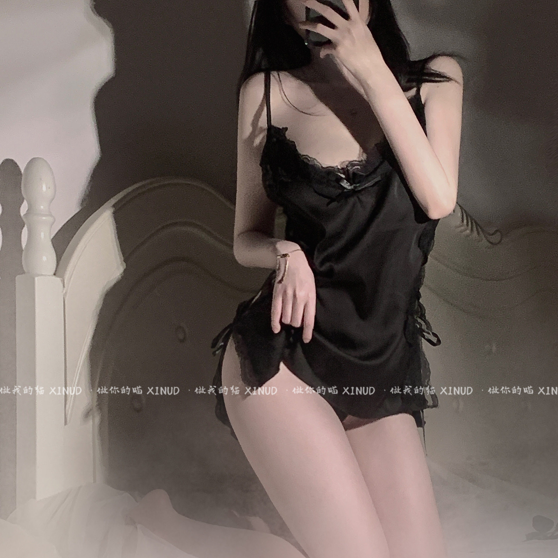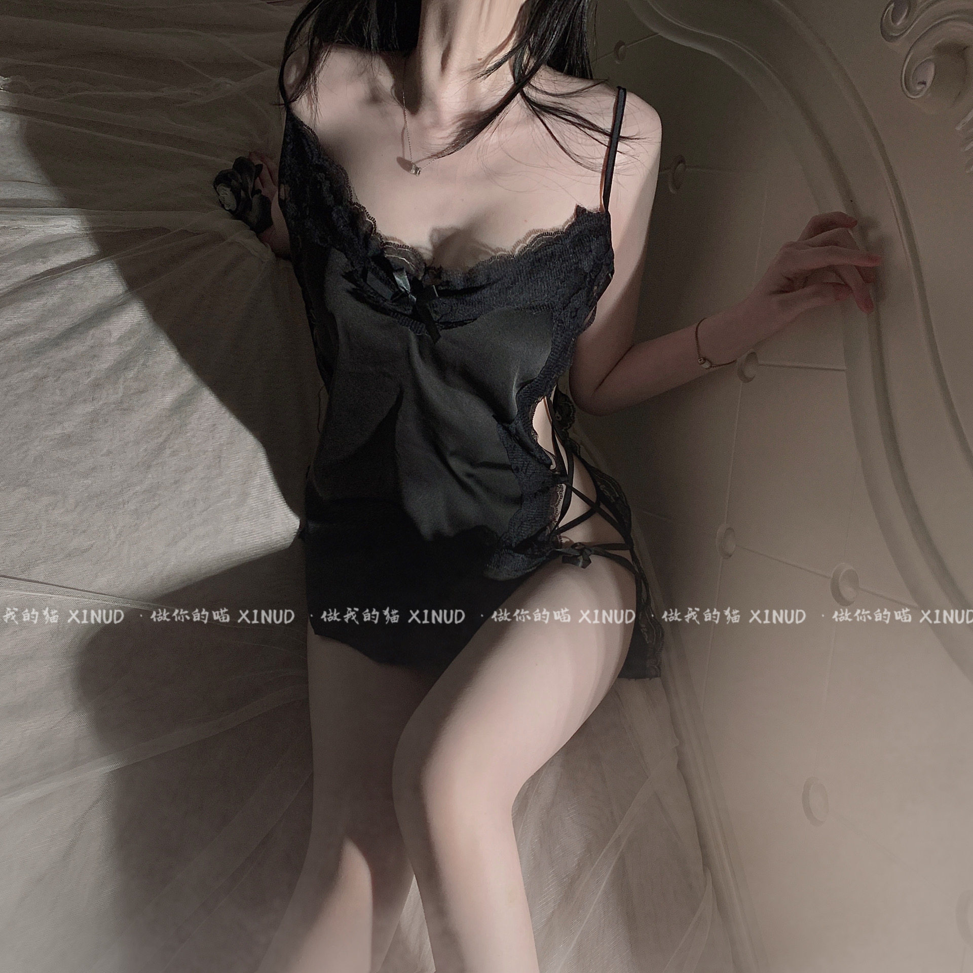 做你的猫:塞纳河畔*新款夏季性感蕾丝吊带冰丝气质交叉镂空睡裙