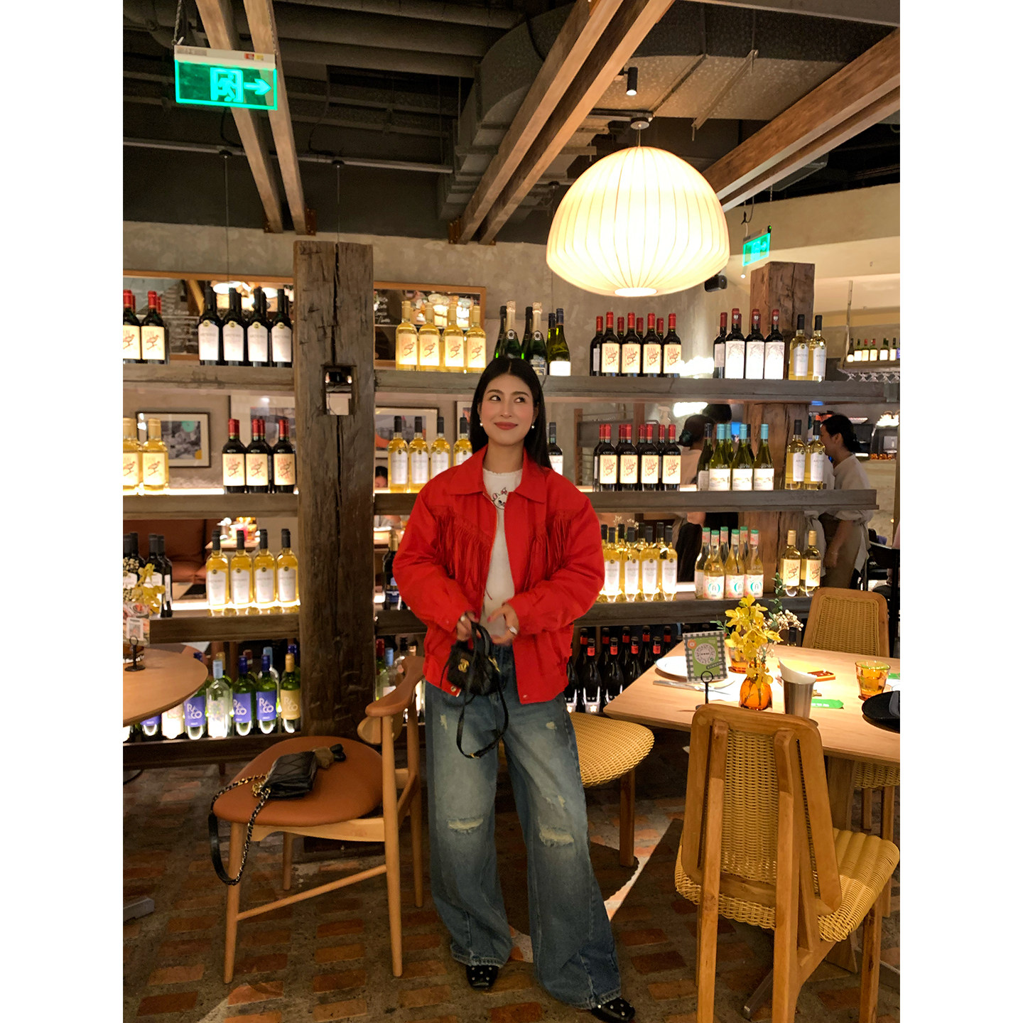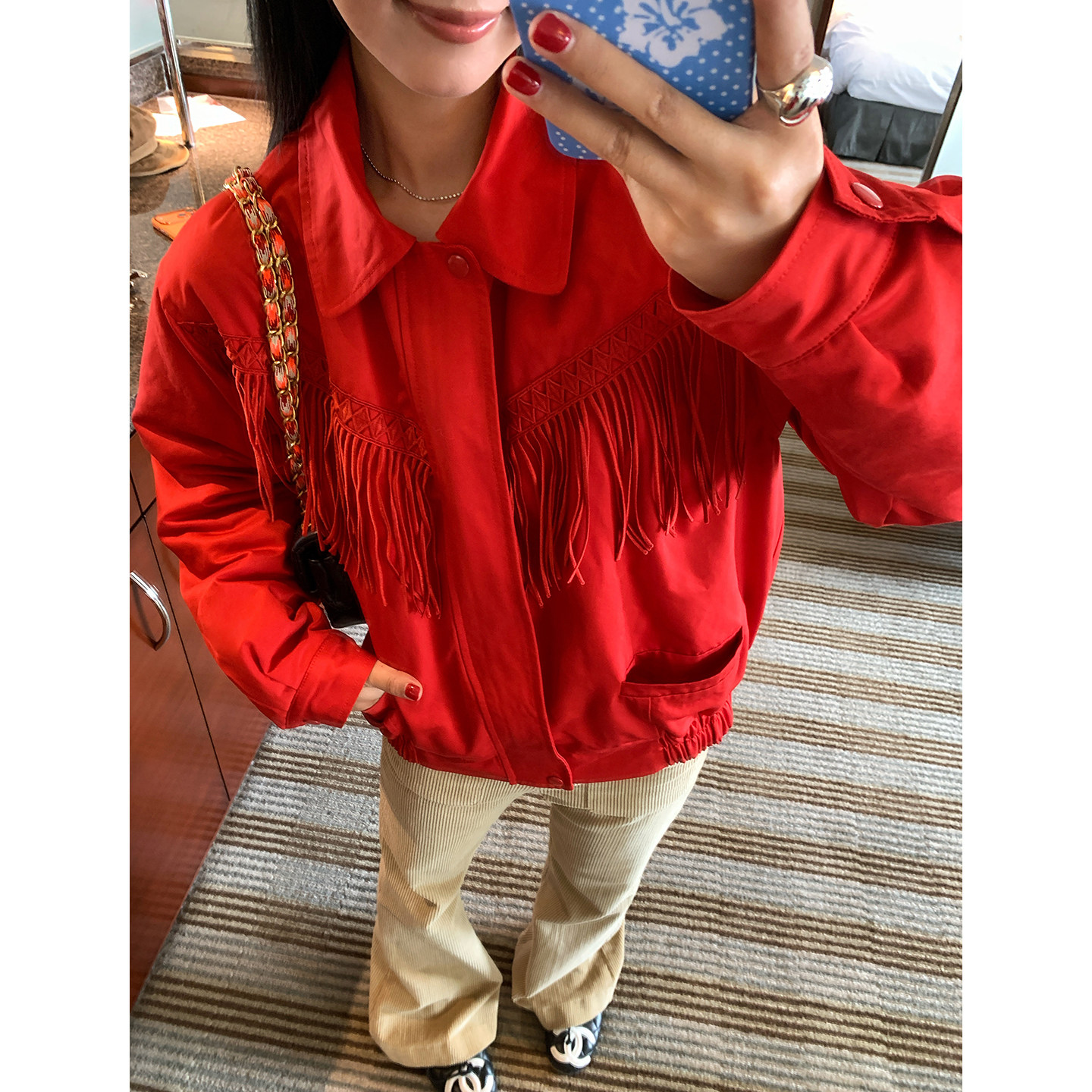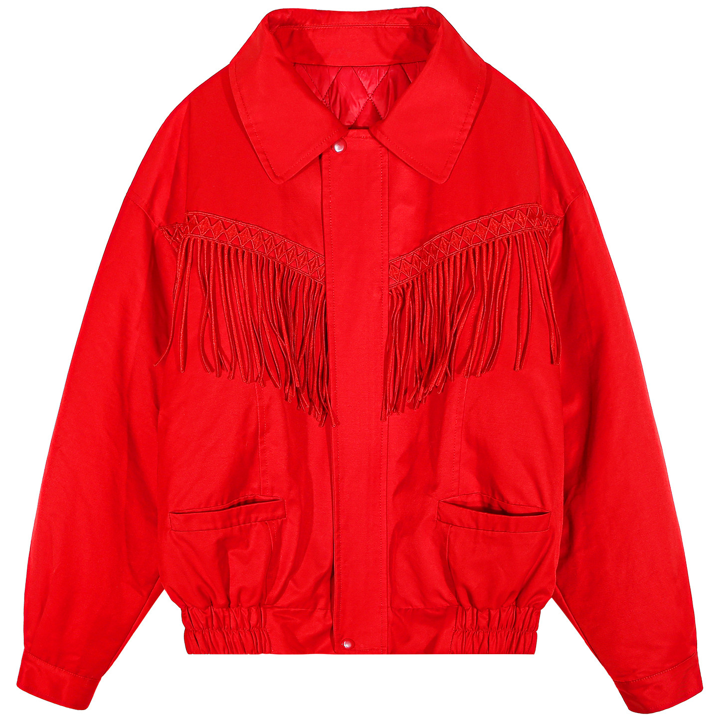 今屿花花 棉服女款2025新款冬设计感流苏夹棉外套小个子红色棉衣