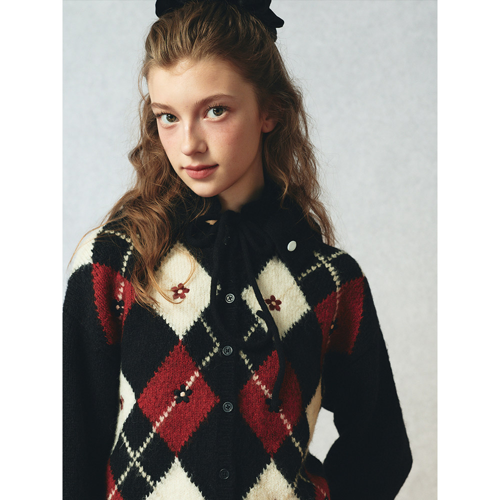 TEENIEWEENIE bearnova25冬新款女装手工绣花菱形格圆领针织开衫