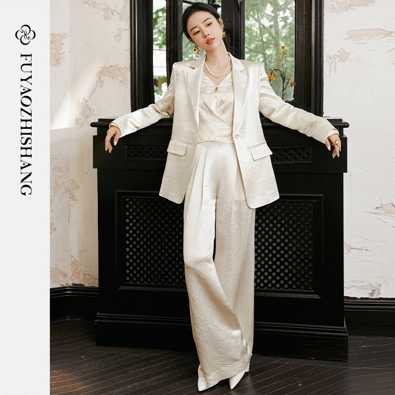 FUYAO扶摇 醋酸缎面西装套装女轻奢国风提花阔版西服直筒裤两件套