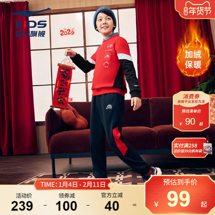鸿星尔克童装儿童运动套装冬季休闲男童加绒红色卫衣长裤两件套