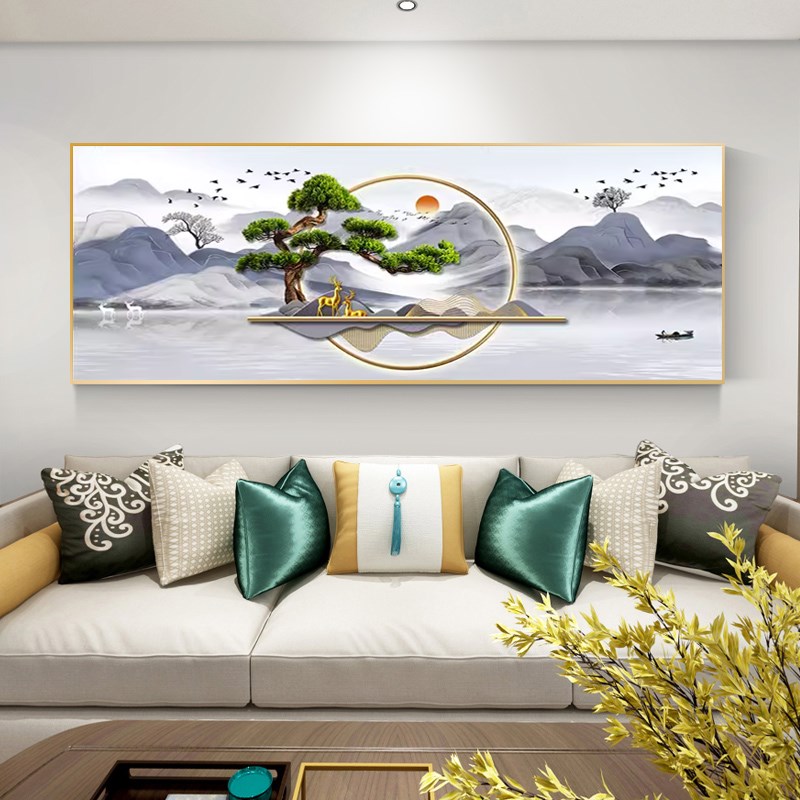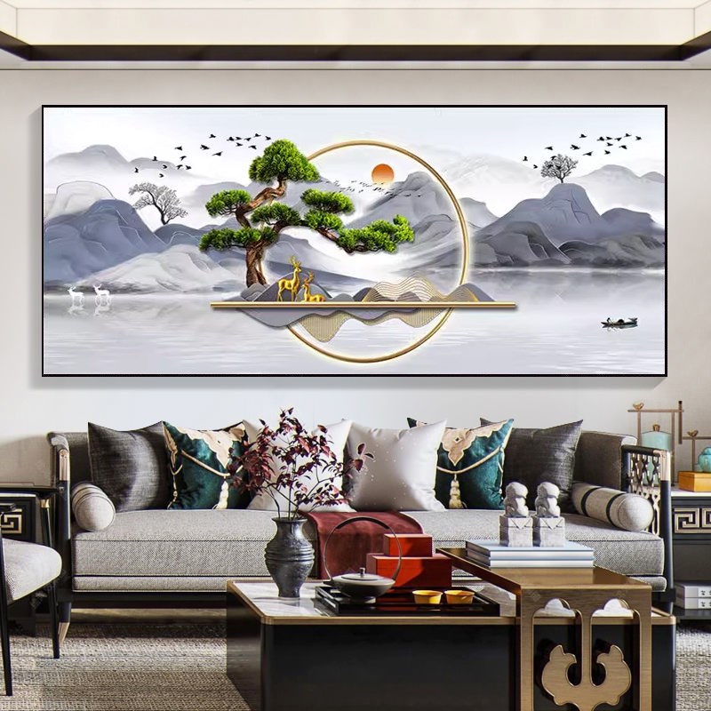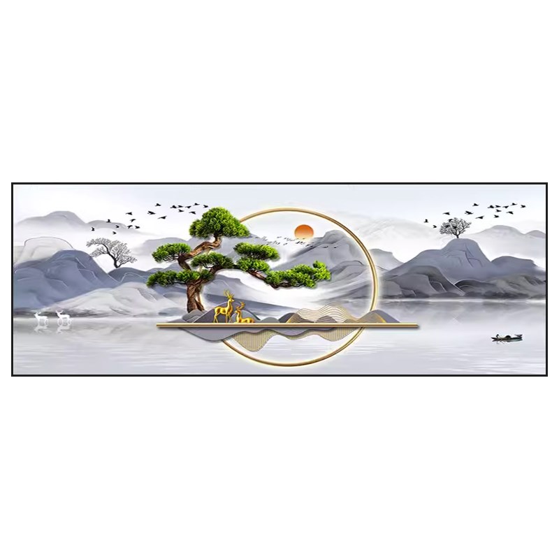 2024新款现代中式迎客松风景钻石画5d满钻手工点砖十字绣流水生财