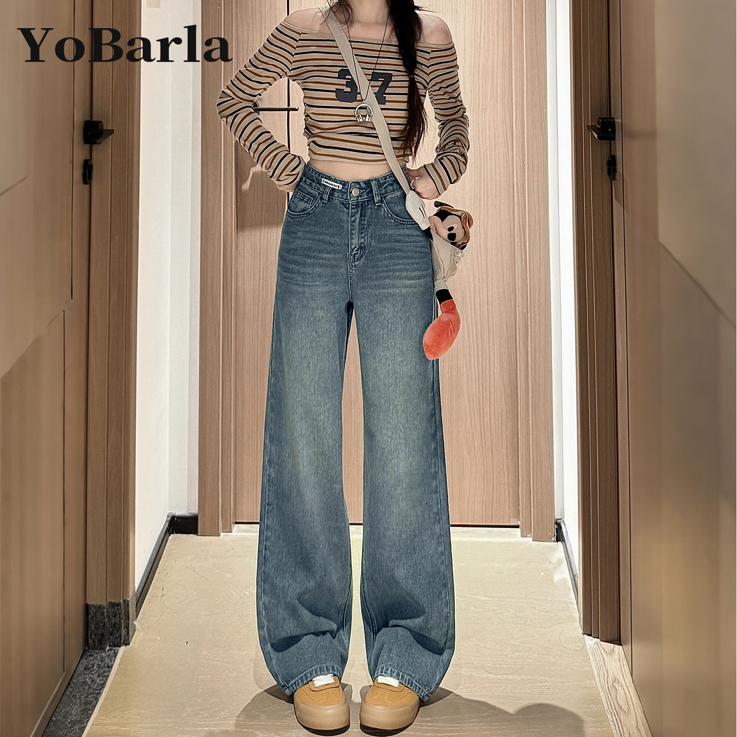 复古蓝直筒牛仔裤女秋冬加绒梨形身材胖mm大码显瘦高腰宽松阔腿裤