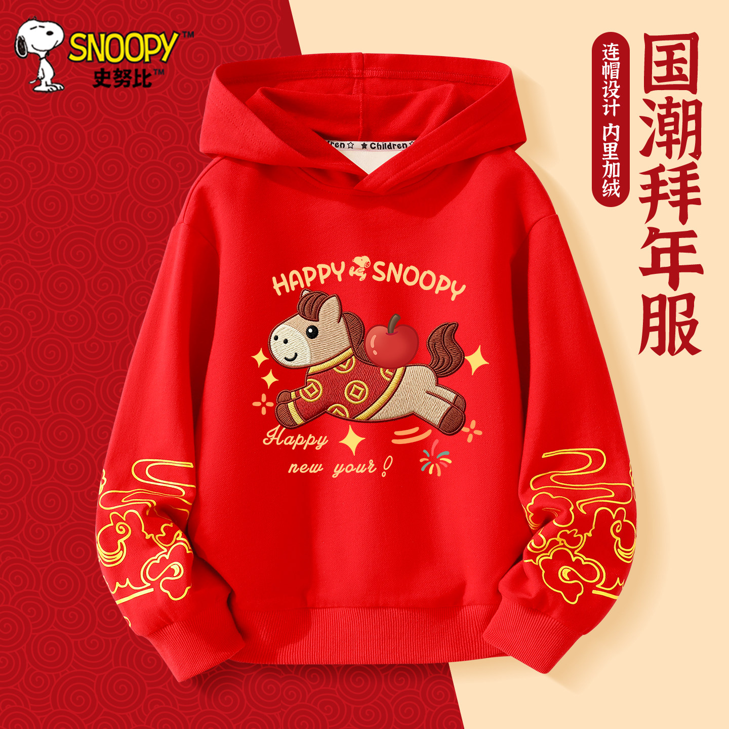 史努比男童红色加绒卫衣2026新年儿童过年服加厚上衣本命年拜年服