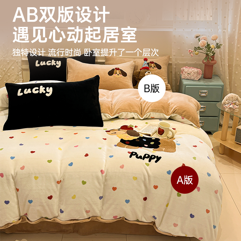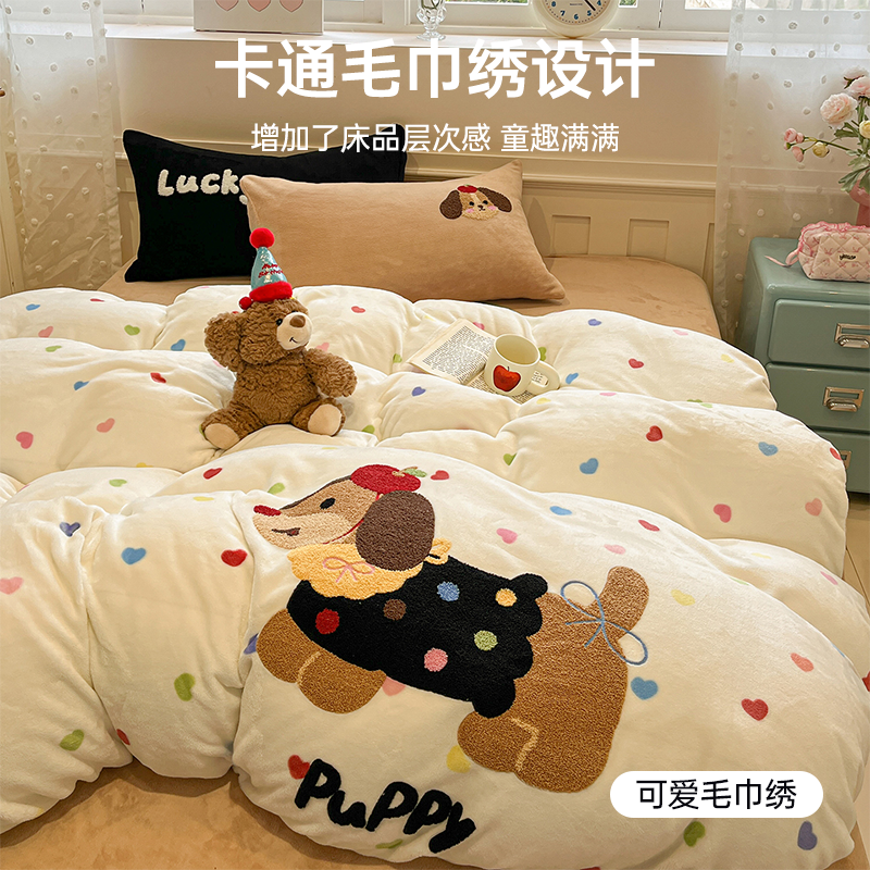 无印良品儿童牛奶绒毛巾绣四件套床品学生被套床单冬季床上三件套