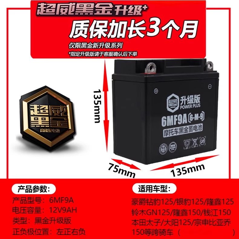 超威男装摩托车电瓶12n9a免维护12v通用干蓄电池125钻豹太子豪爵
