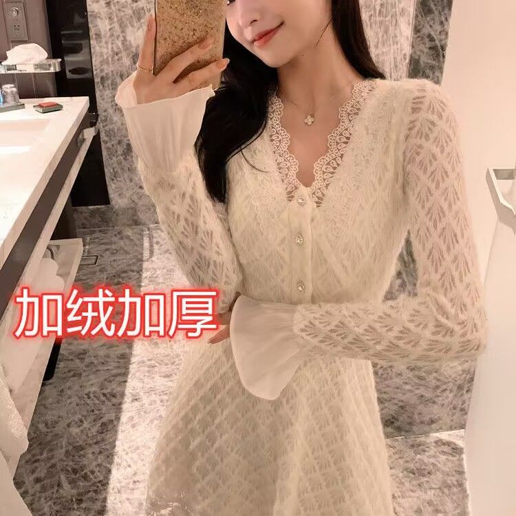 2023秋冬新款女神范气质仙女蕾丝加绒长袖连衣裙甜美别致温柔裙