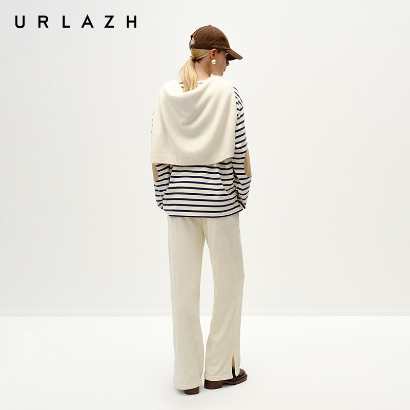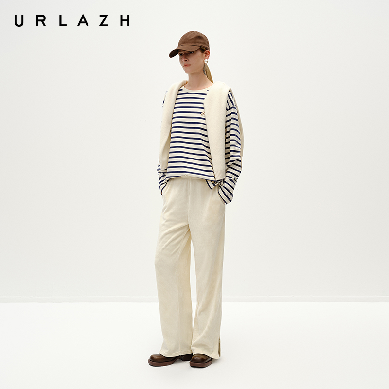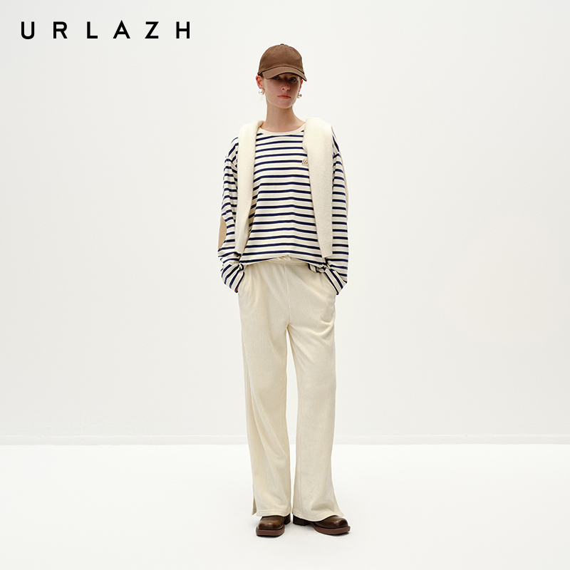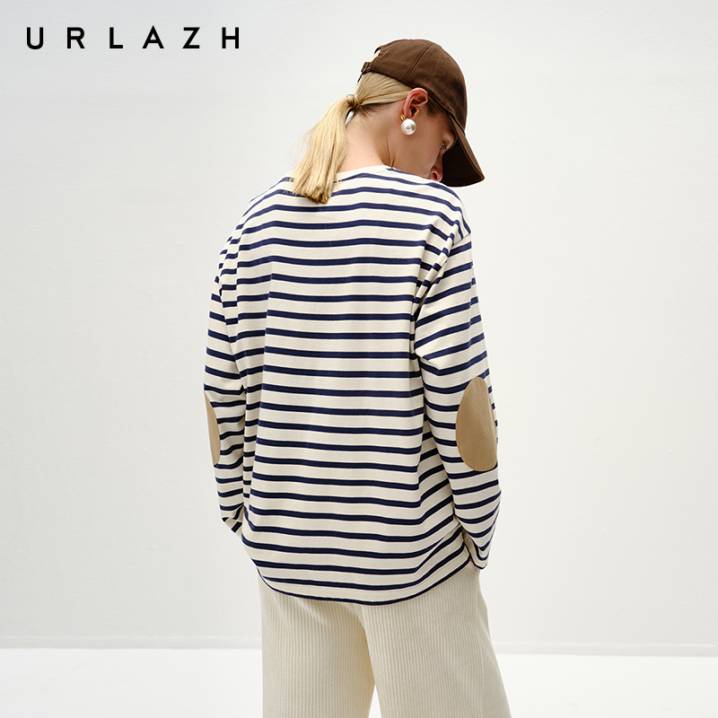 URLAZH有兰冬季新款复古纯棉撞色条纹宽松圆领休闲长袖T恤上衣女