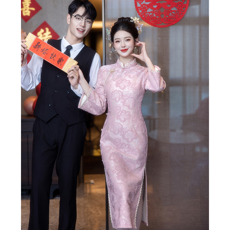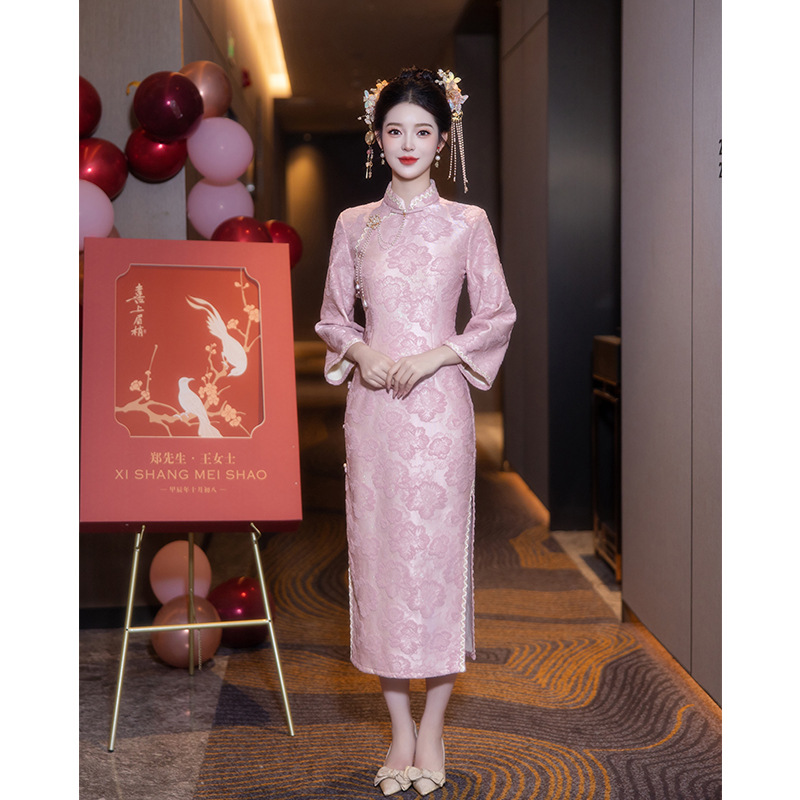 粉色旗袍敬酒服新娘新中式订婚礼服裙结婚回门便装秋冬季日常
