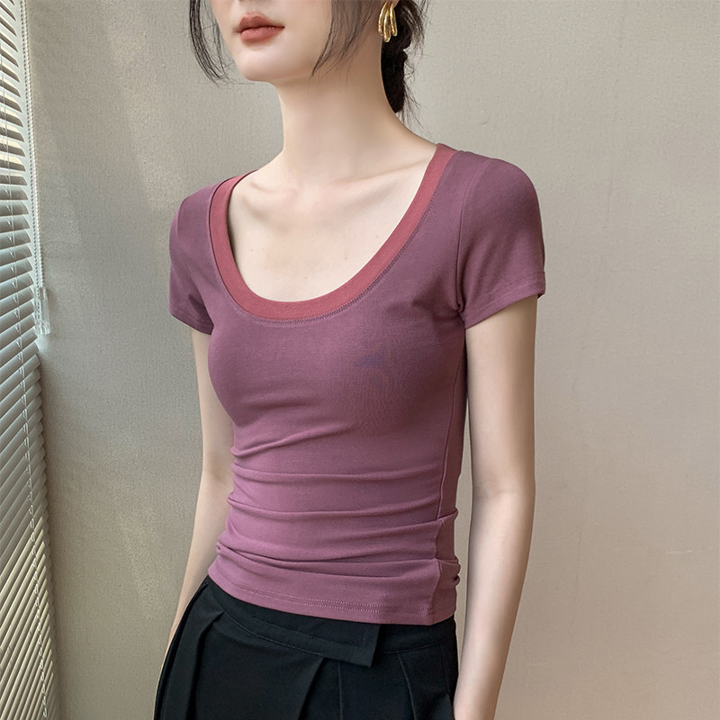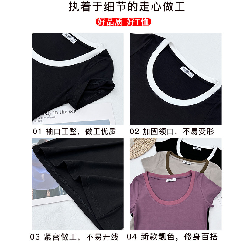 歌倍尚大圆领t恤女短袖2025夏天新款修身U领半袖正肩百搭上衣薄