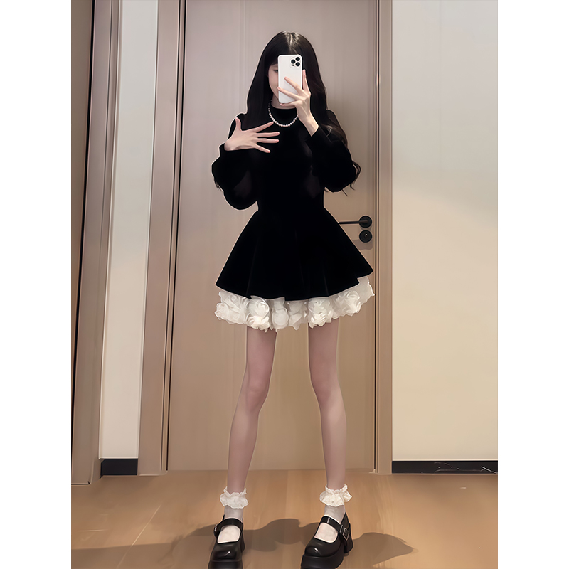法式高级感黑色丝绒拼接连衣裙女秋冬款木耳边下摆设计感A字短裙