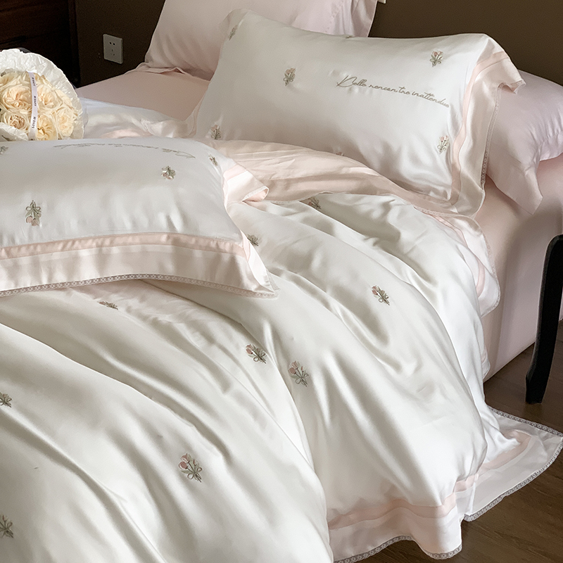 少女心夏季80支兰精天丝四件套浪漫花卉刺绣凉感丝滑1.8m床上用品