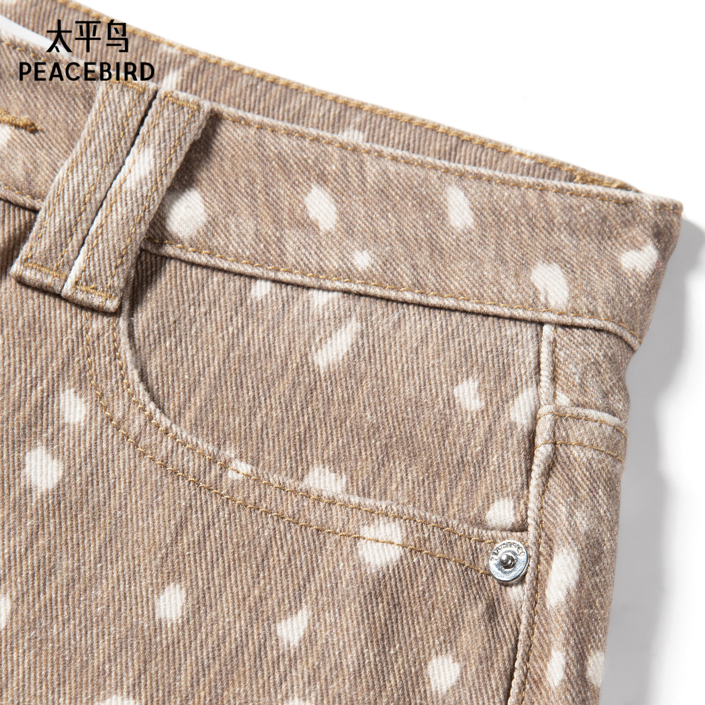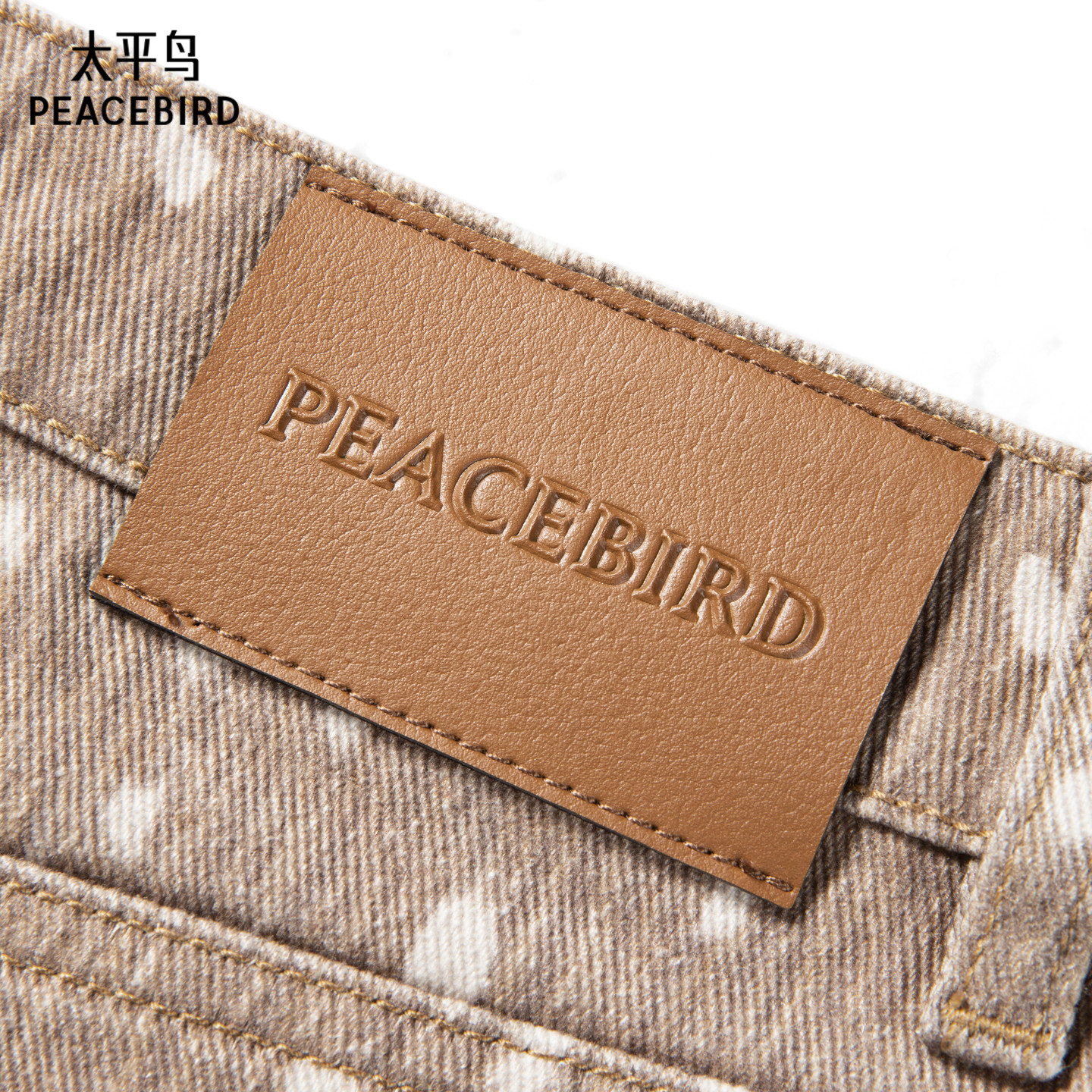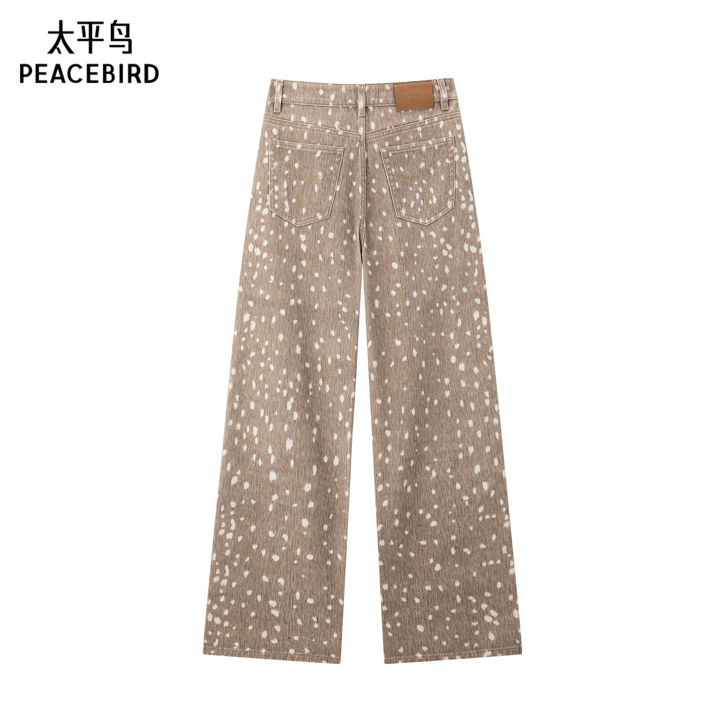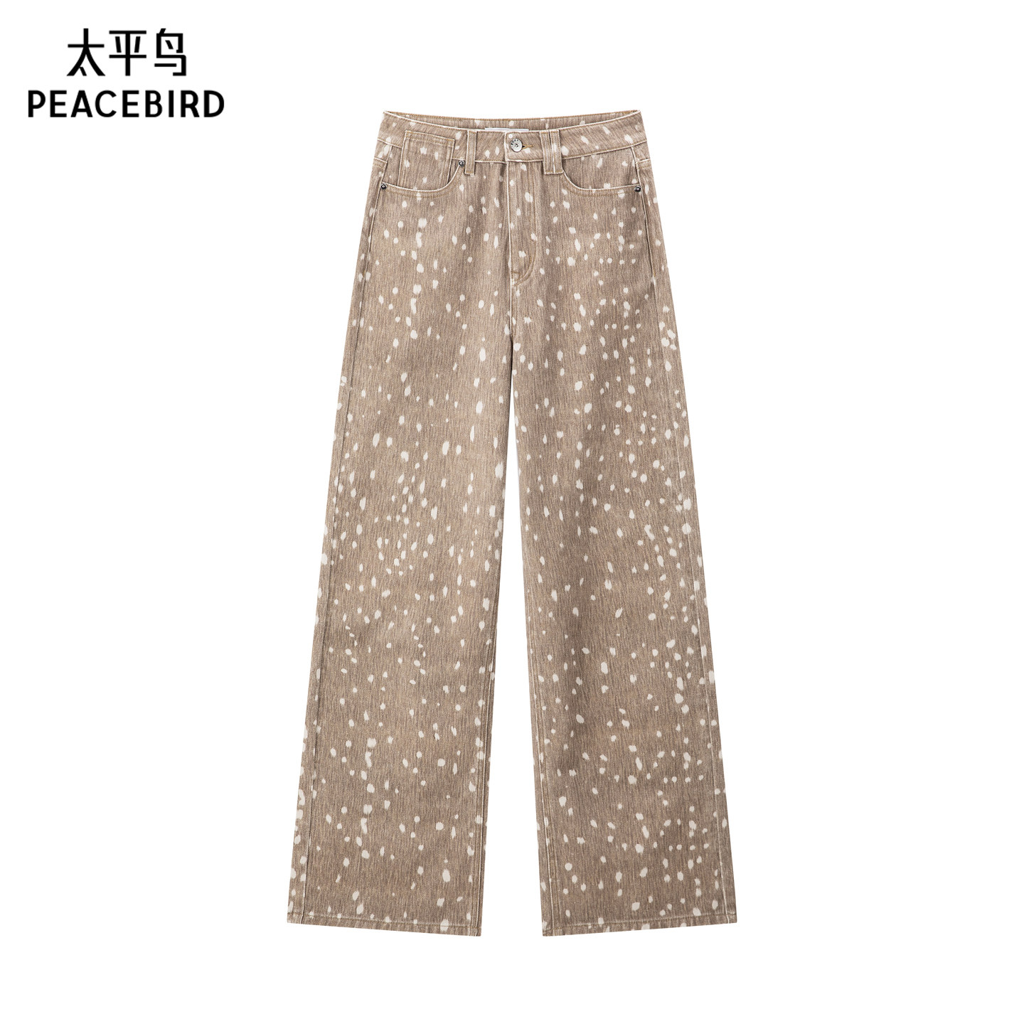 太平鸟高腰鹿纹印花牛仔裤2025年冬季新款保暖磨毛阔腿直筒牛仔裤