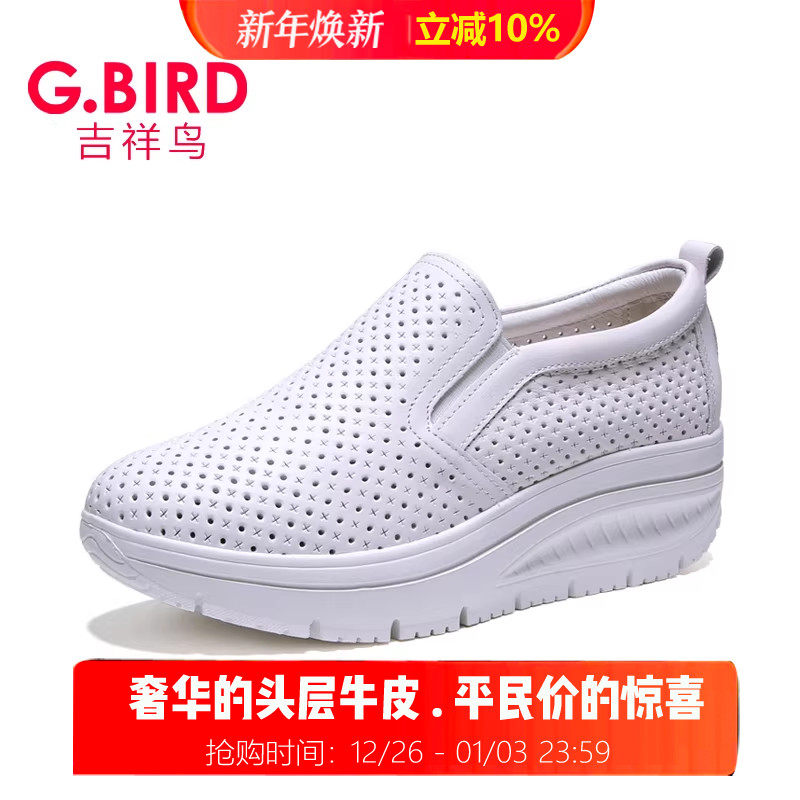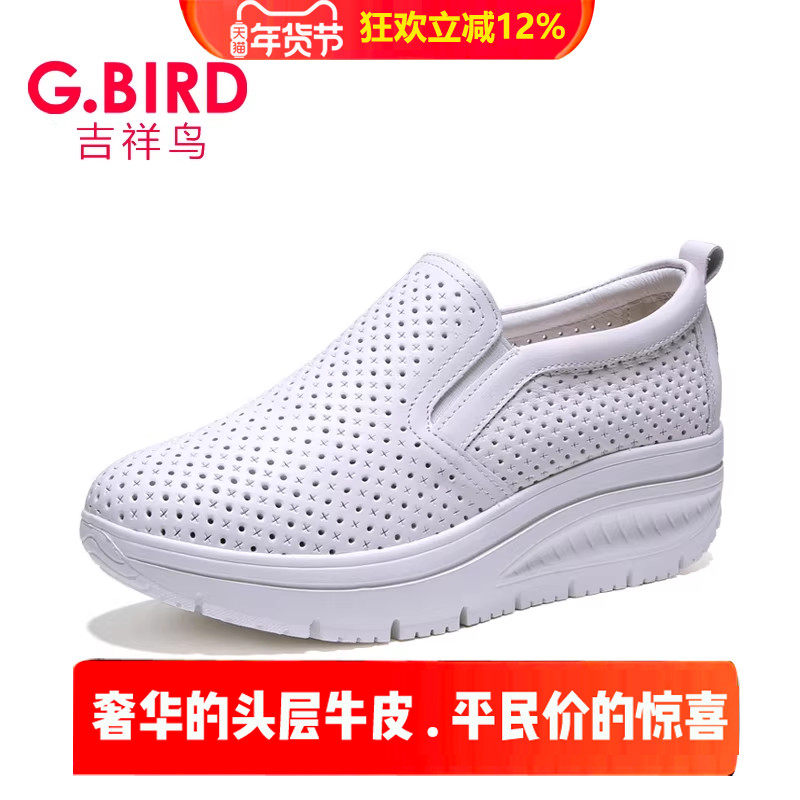 【盛典特价】吉祥鸟真皮透气女鞋镂空百搭厚底松糕一脚蹬休闲0803