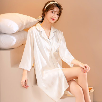 睡裙女士春秋款冰丝白色性感衬衣衬衫夏季七分袖睡衣连衣裙家居服