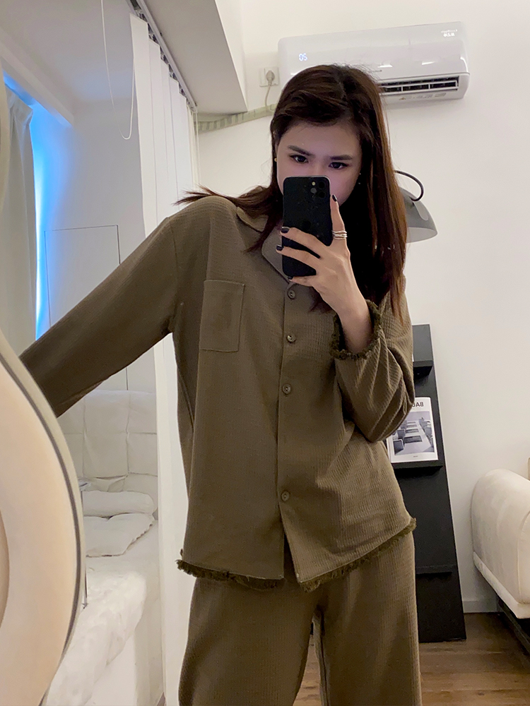 日系新款睡衣女华夫格慵懒春秋长袖长裤纯色ins女士可外穿家居服