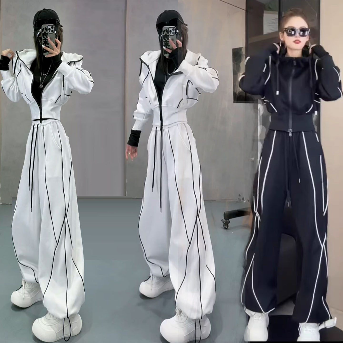 欧货休闲运动套装女2025春秋季宽松拉链连帽卫衣工装阔腿裤两件套
