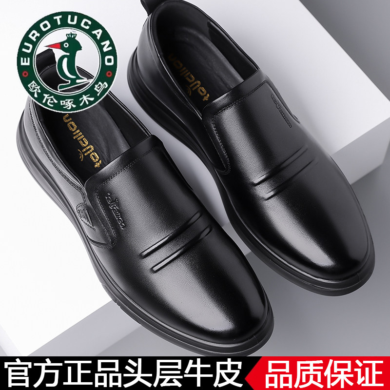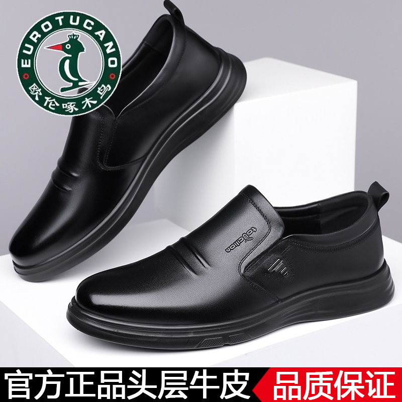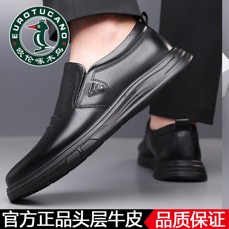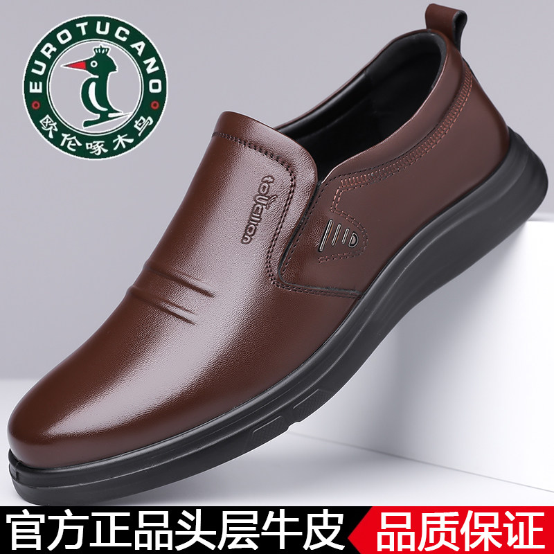100%全牛皮欧伦啄木鸟秋季真皮商务休闲皮鞋男士软底中老年爸爸鞋