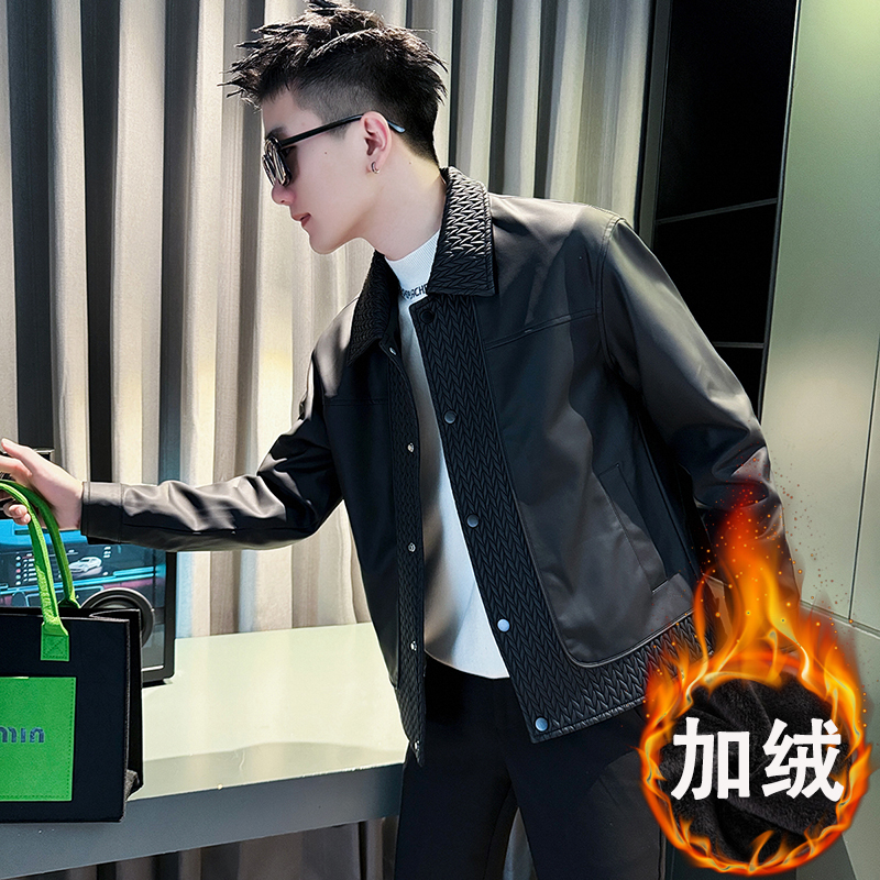 加绒潮牌百搭男装皮衣加厚翻领
