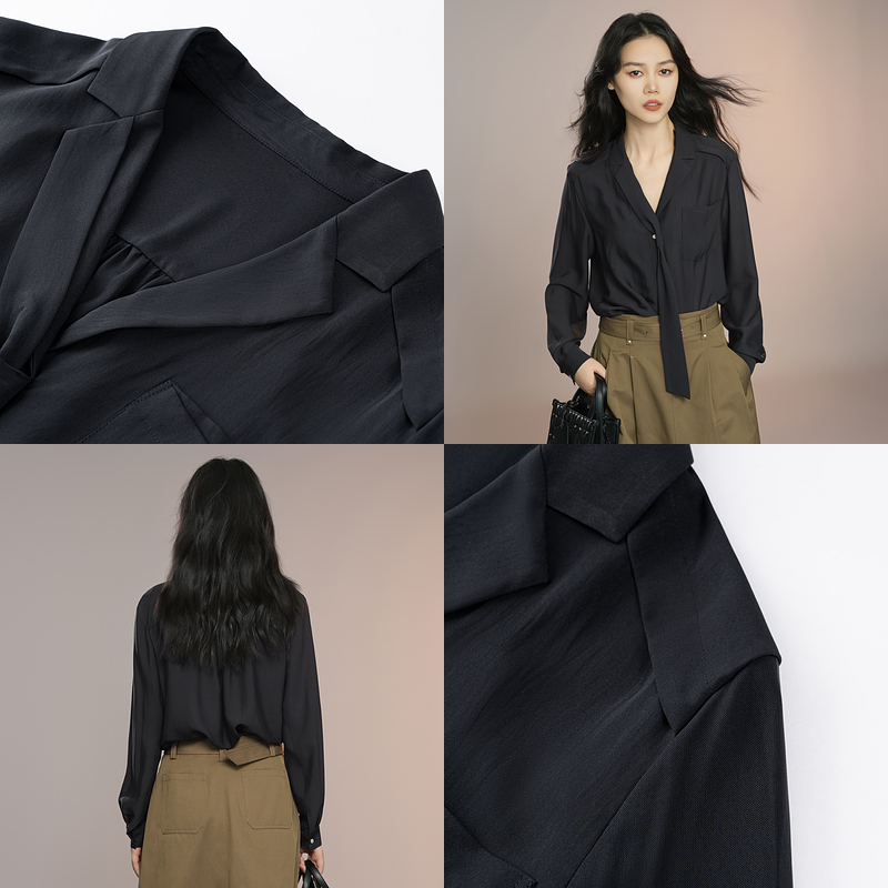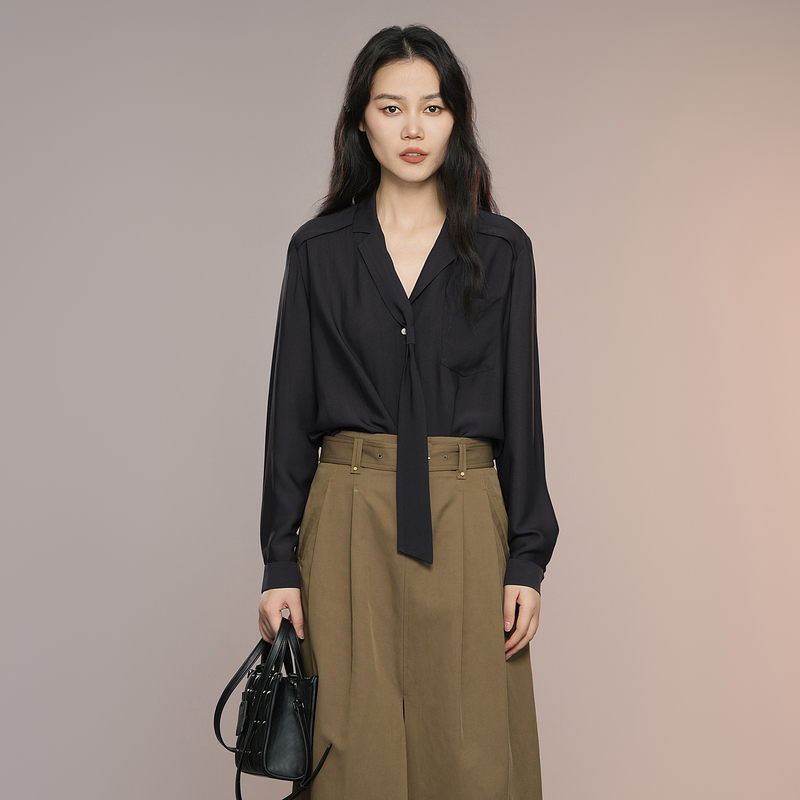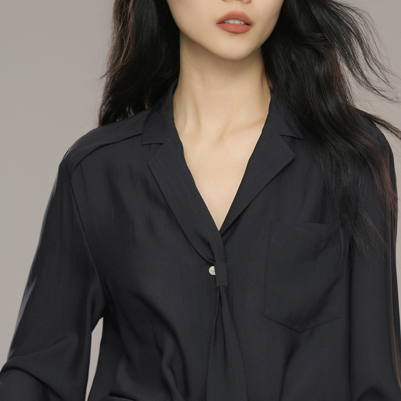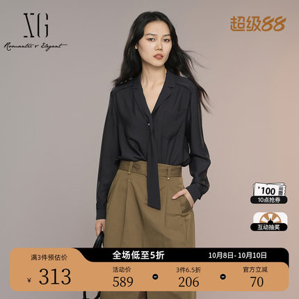 XG雪歌黑色微弹设计长袖衬衫2025秋季新款通勤简约系带领上衣女装