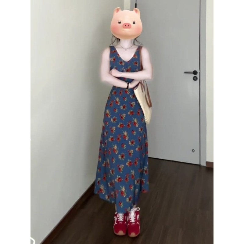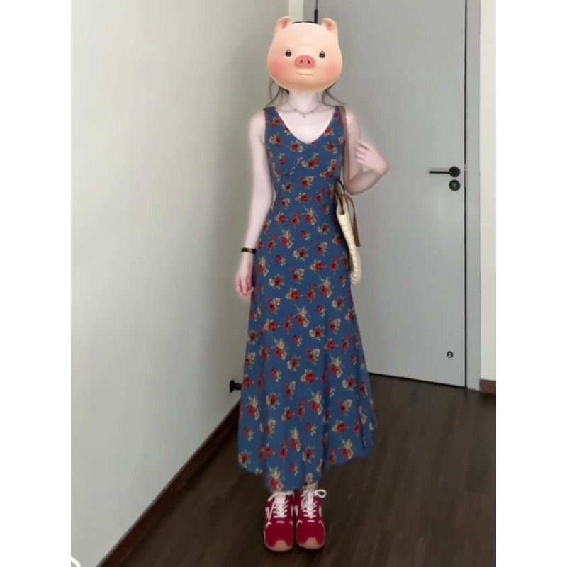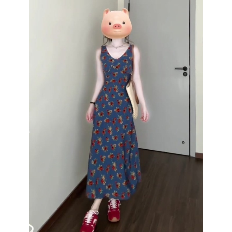 米洛斯游记~蓝色V领欧根纱拼接收腰碎花连衣裙子女春夏无袖背心裙