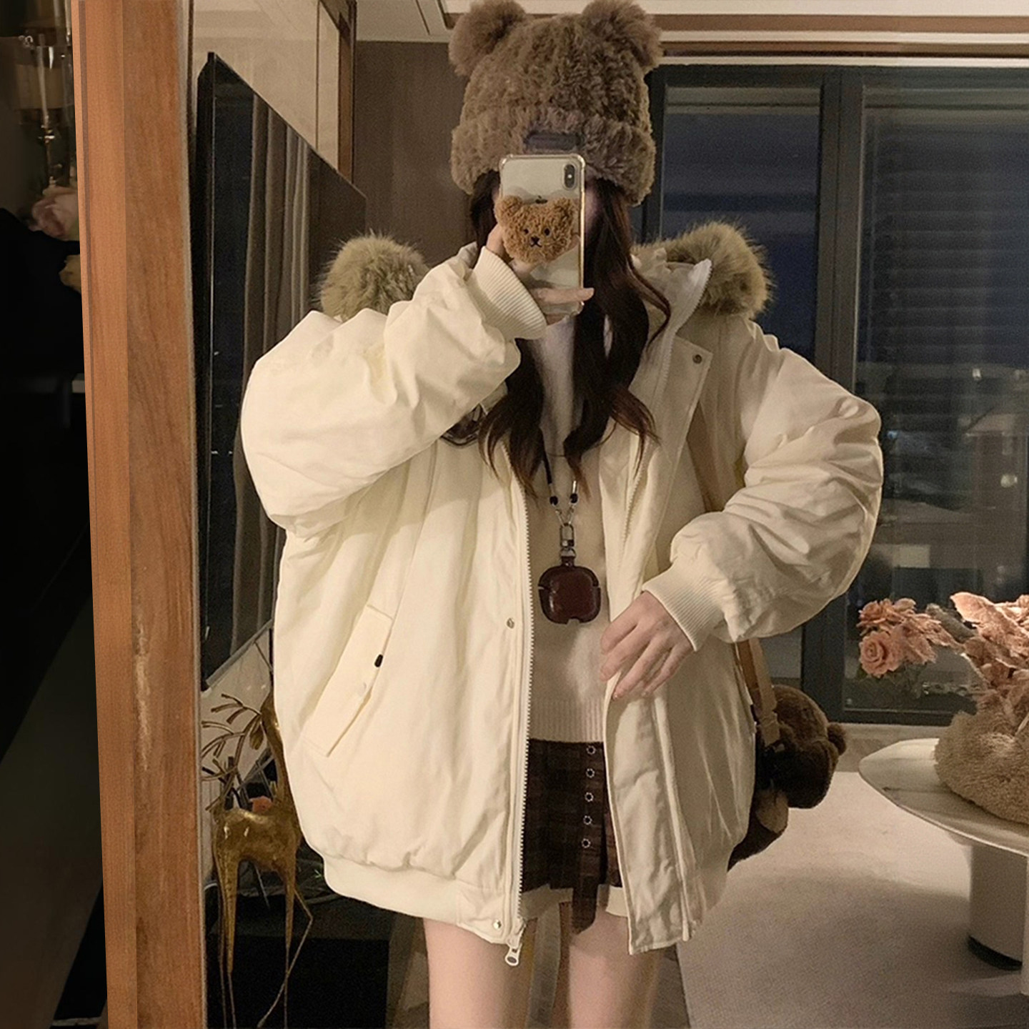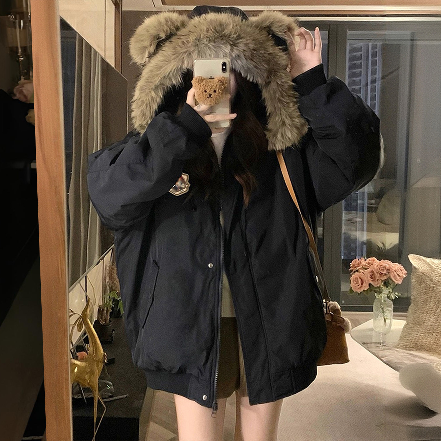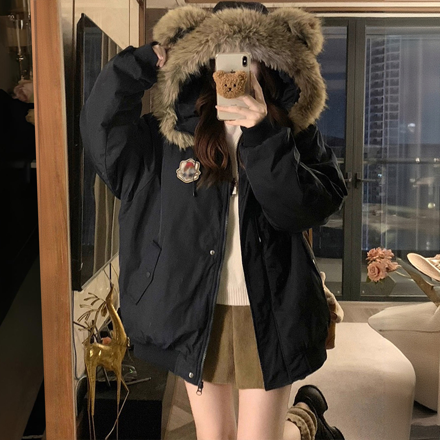 大码女装胖mm简约风高级感藏青色棉服女秋冬加厚保暖小熊连帽外套