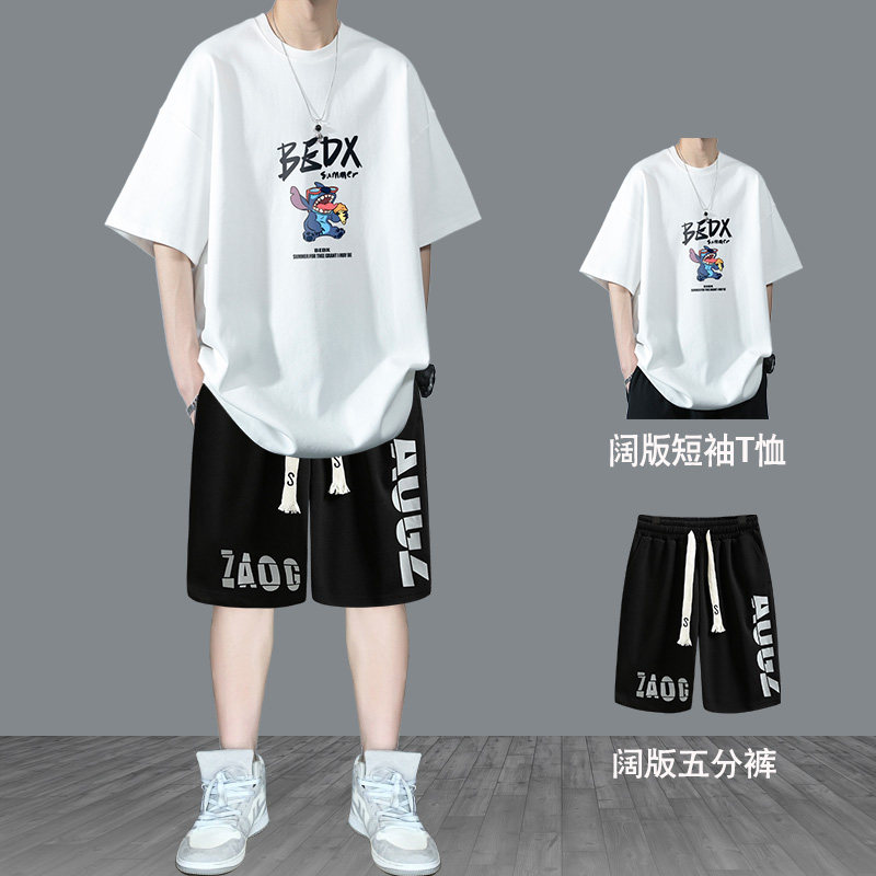 纯棉青少年夏季宽松套装男生短袖T恤新款大高中学生潮流休闲运动