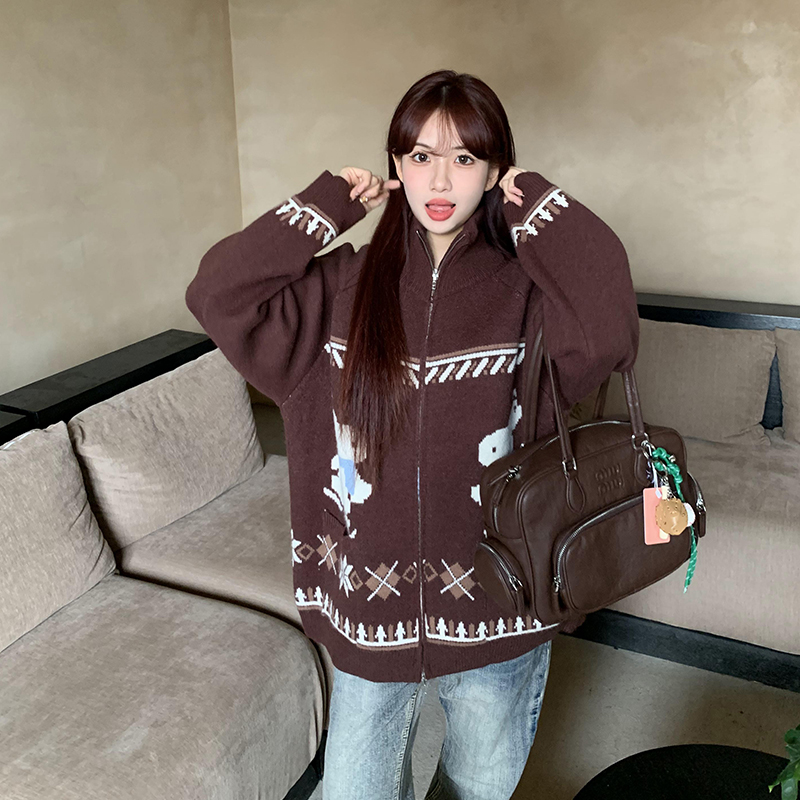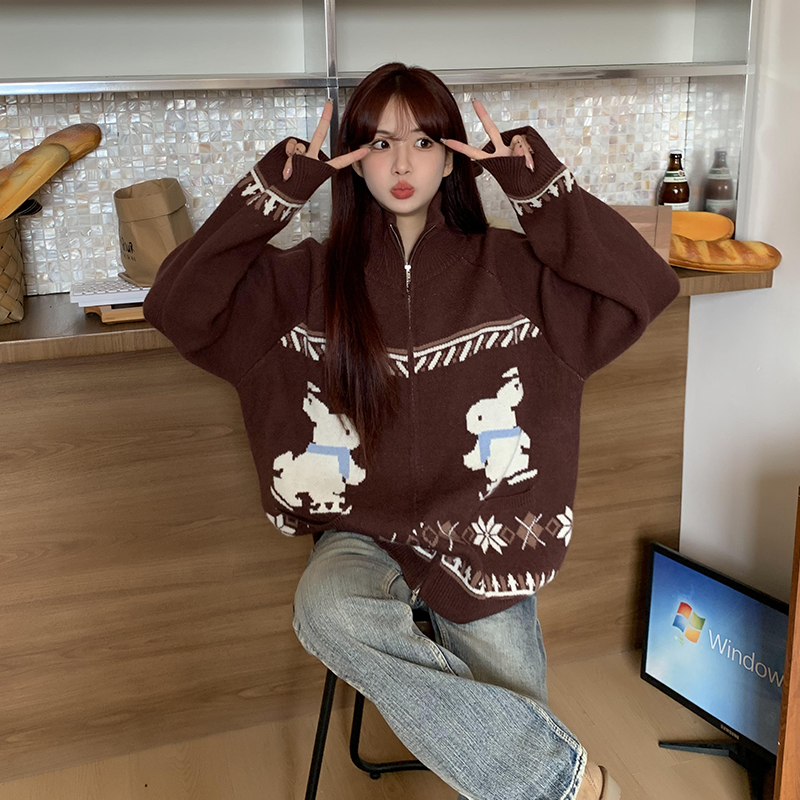 美式复古兔子提花毛衣外套女秋冬