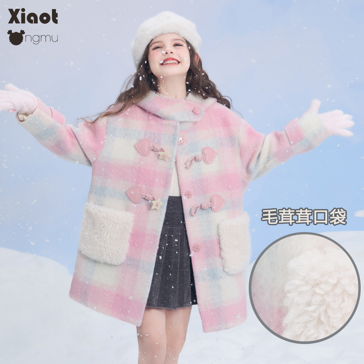 小童木 粉蓝格纹女童毛呢外套冬季新款星星牛角扣中大童呢子大衣
