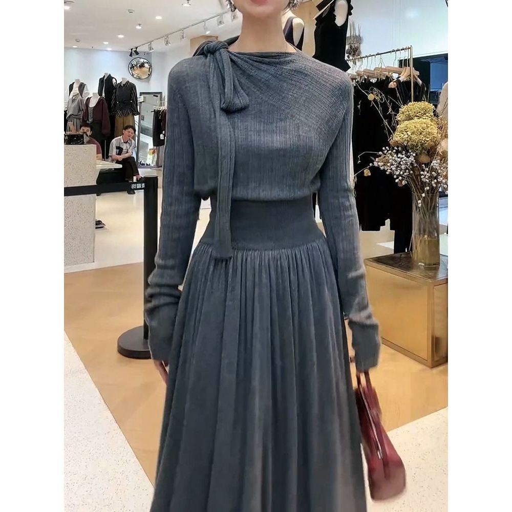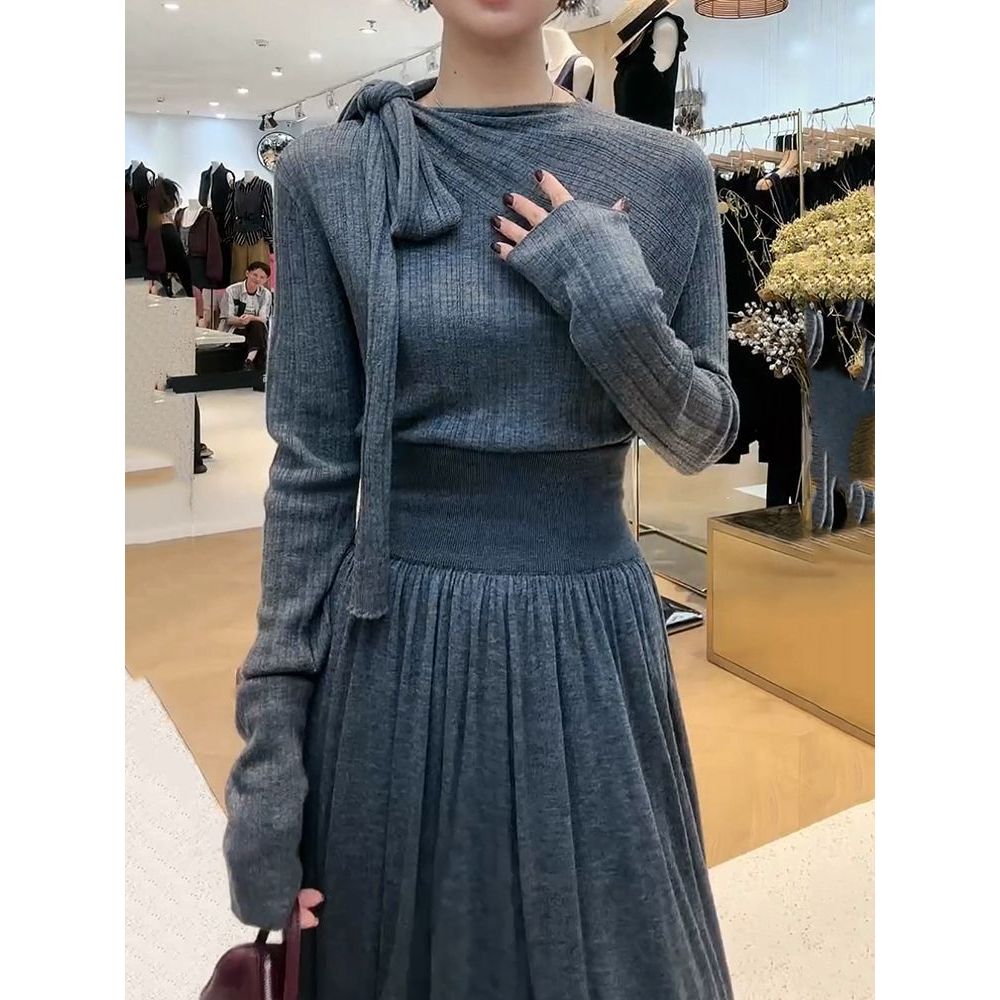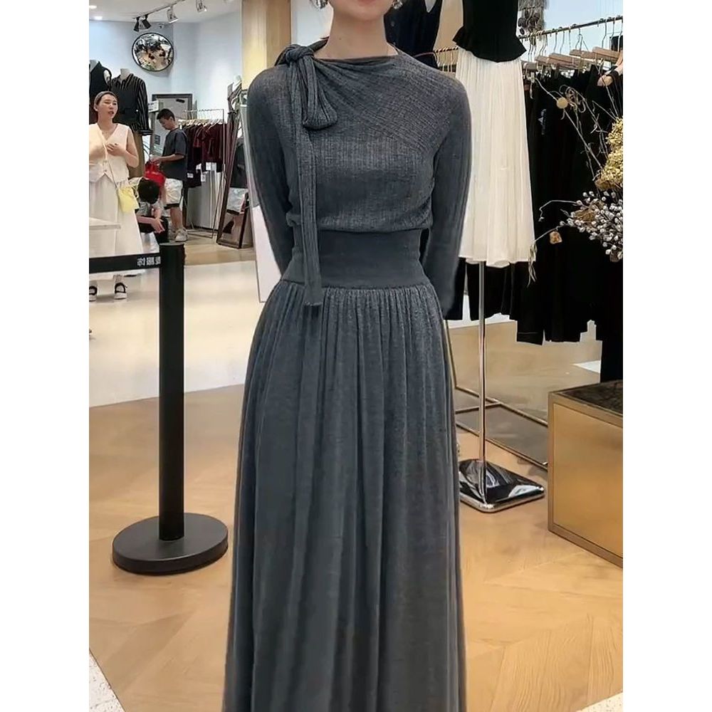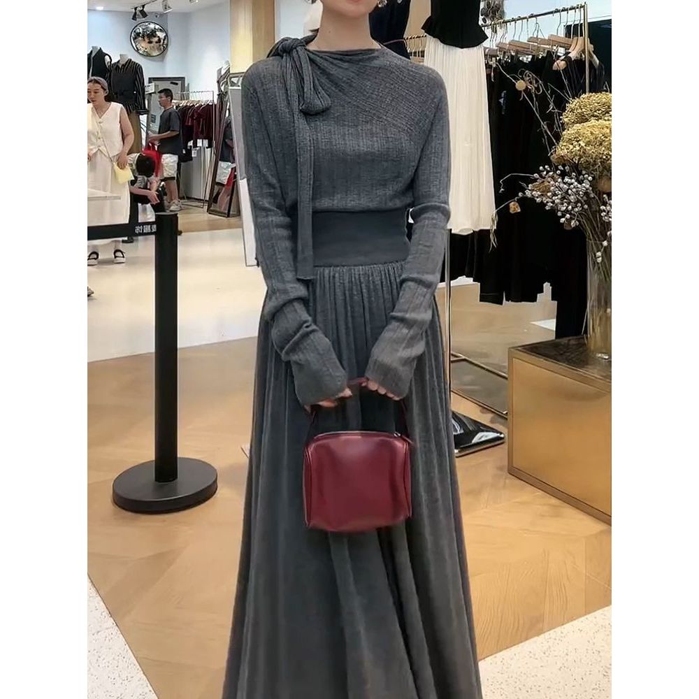 时尚气质纯色针织长裙套装女秋季新款洋气优雅长袖上衣+半身裙