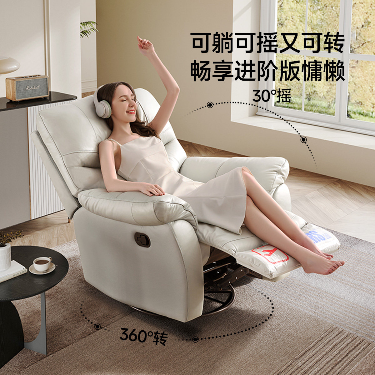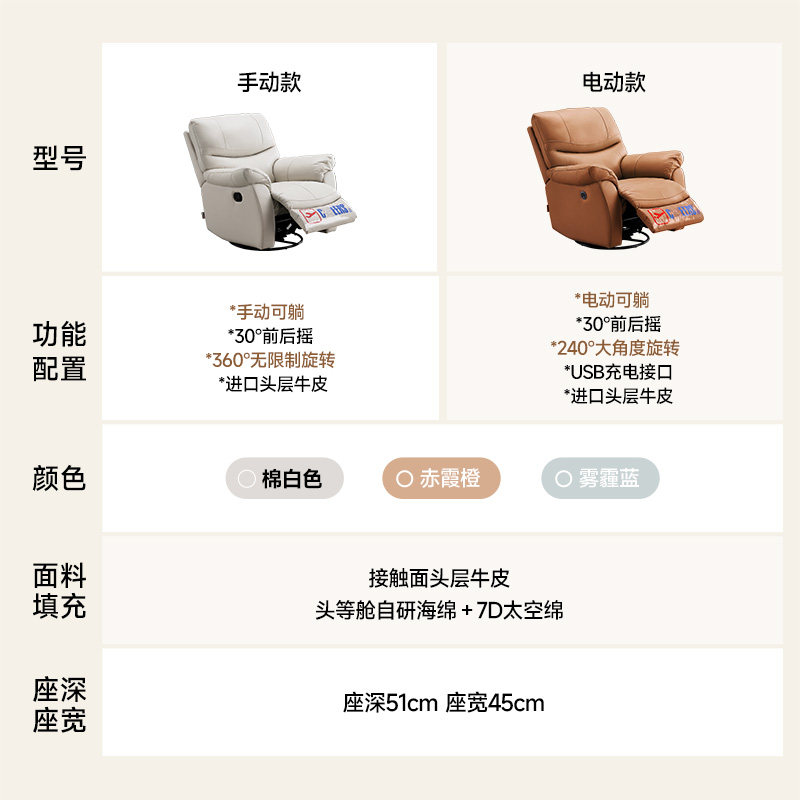 芝华仕头等舱单人真皮懒人沙发可摇可转休闲功能单椅芝华士K1232