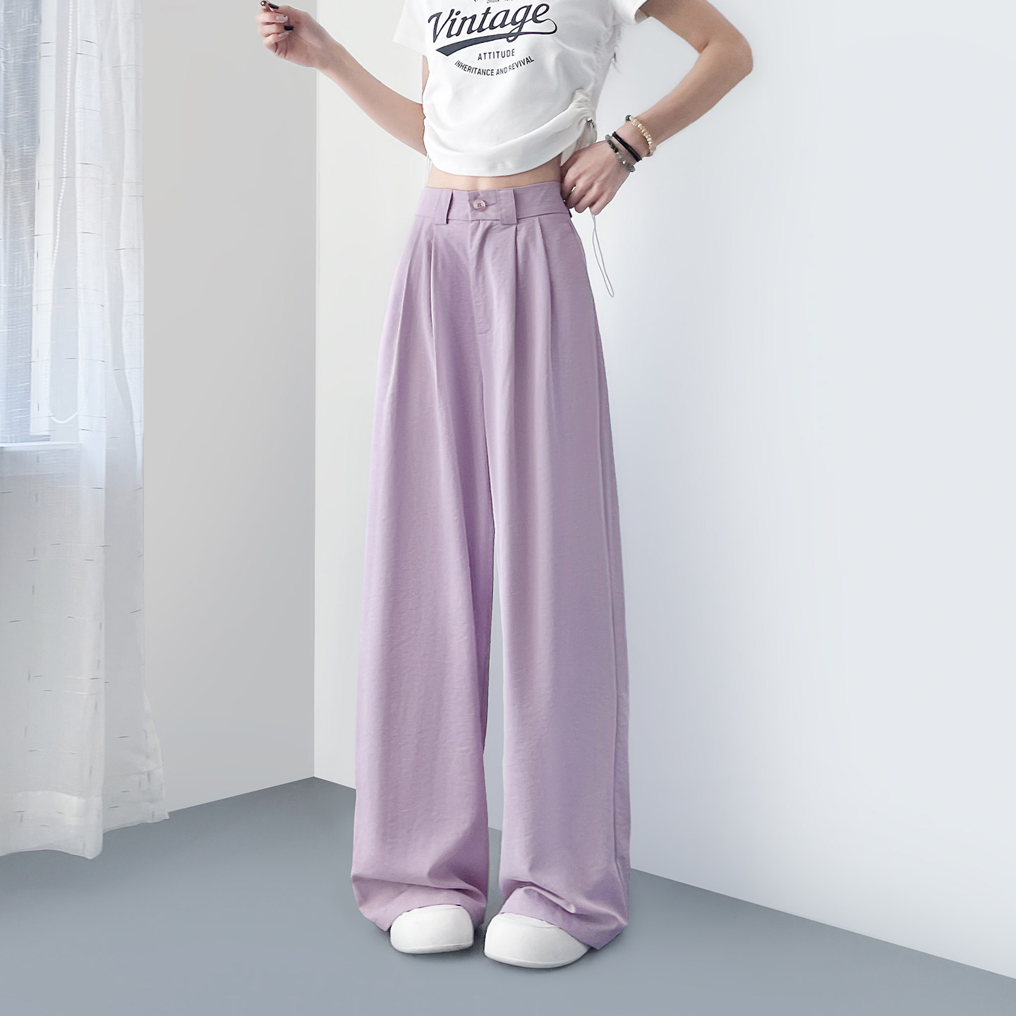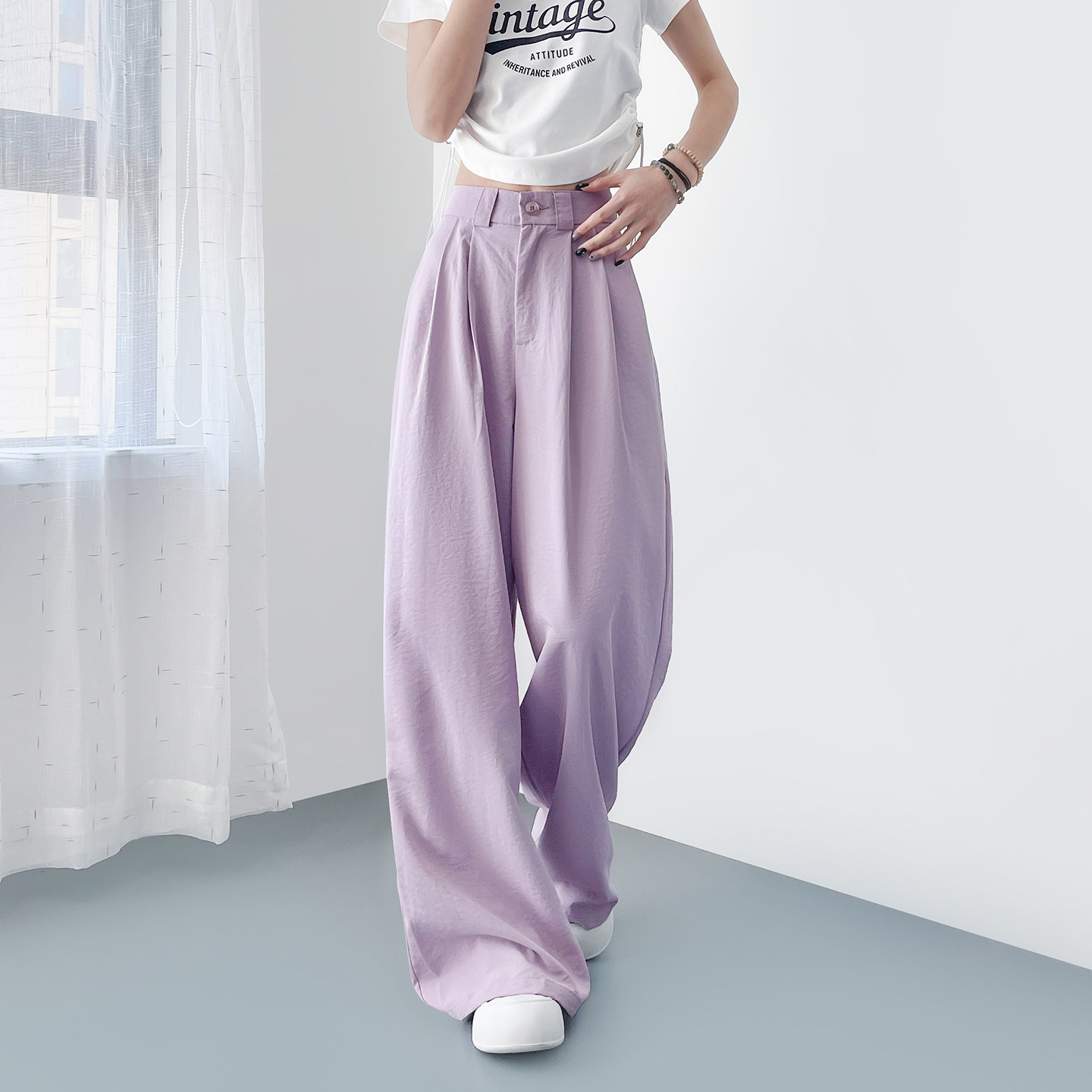 大码紫色垂感软糯西装裤女春季薄款胖mm直筒慵懒冰丝山本阔腿裤子