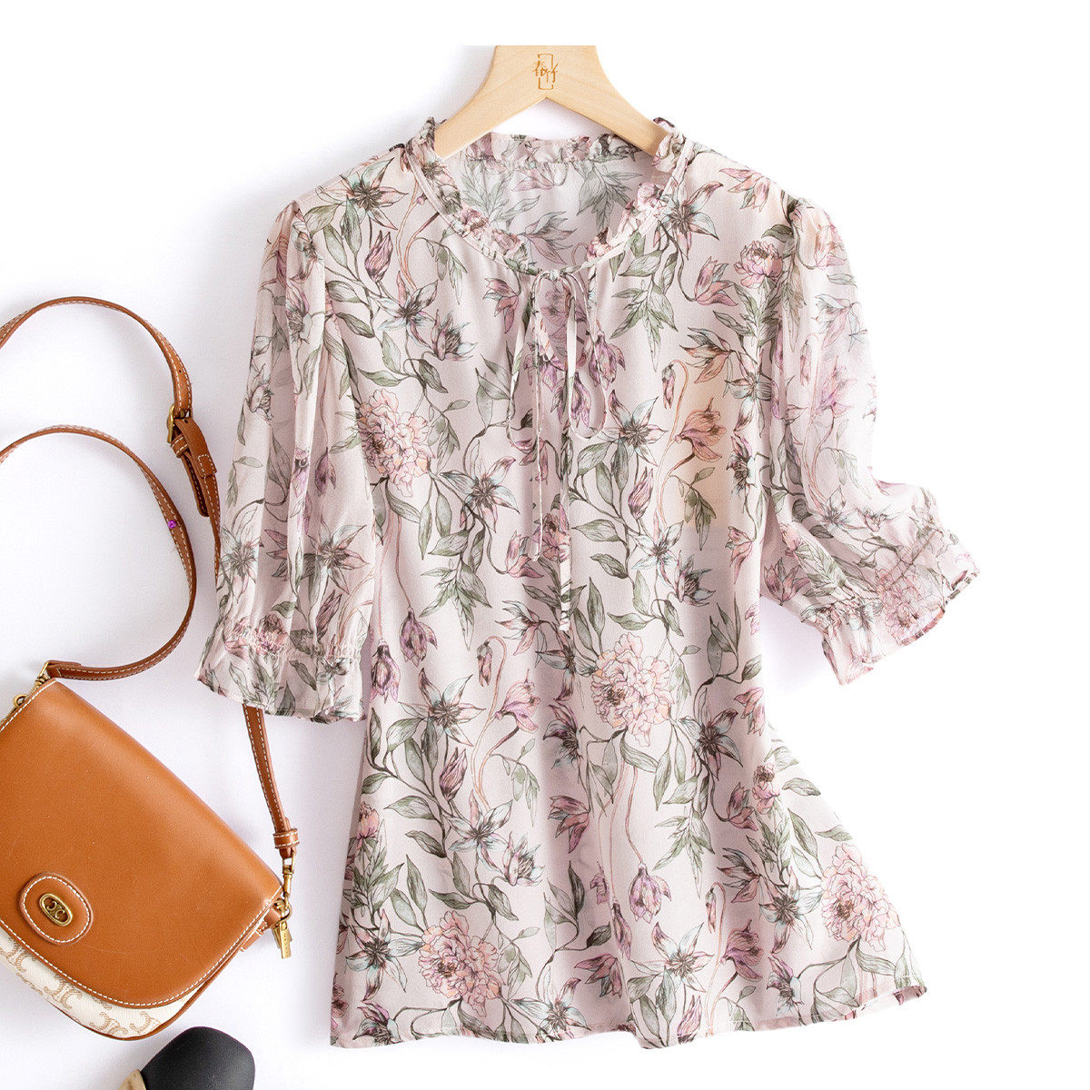 春竹2026春夏新款100%桑蚕丝上衣女妈妈印花气质休闲短袖真丝衬衫