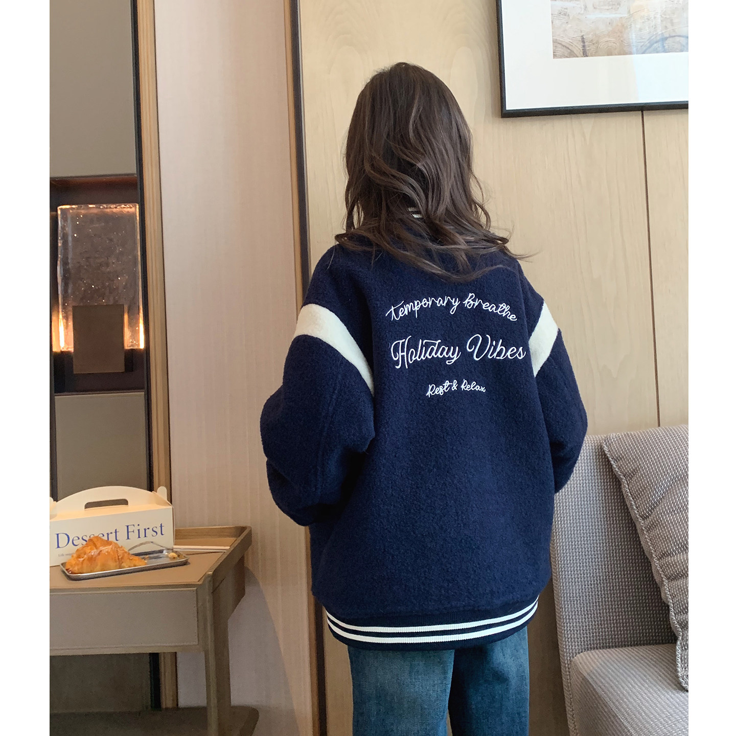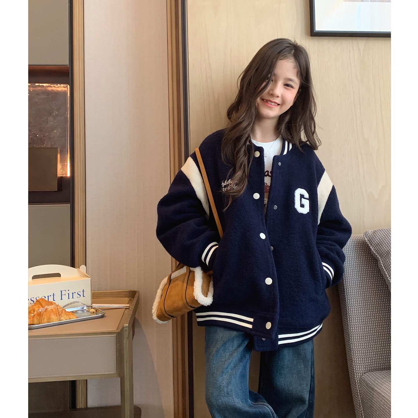 女大童藏青拼色毛绒棒球服2025冬季新款青少年加绒夹克学生厚外套