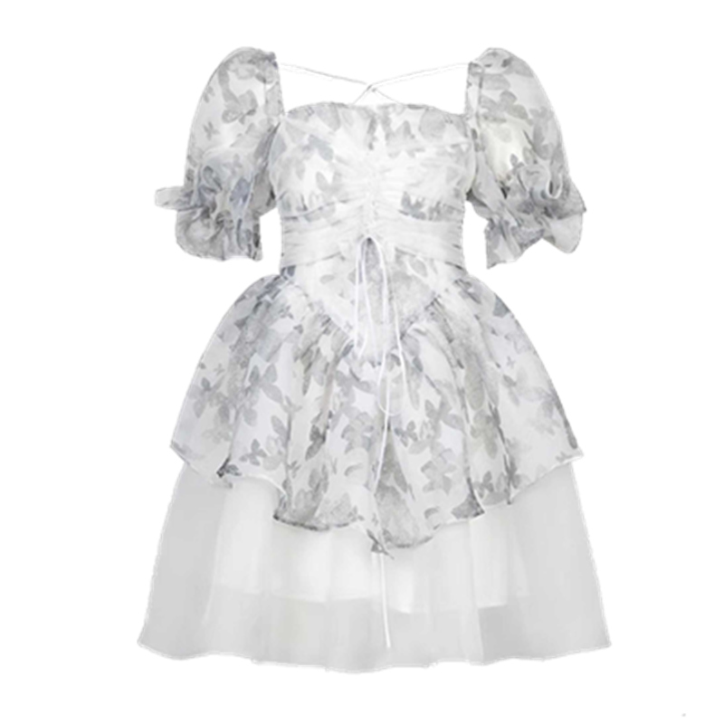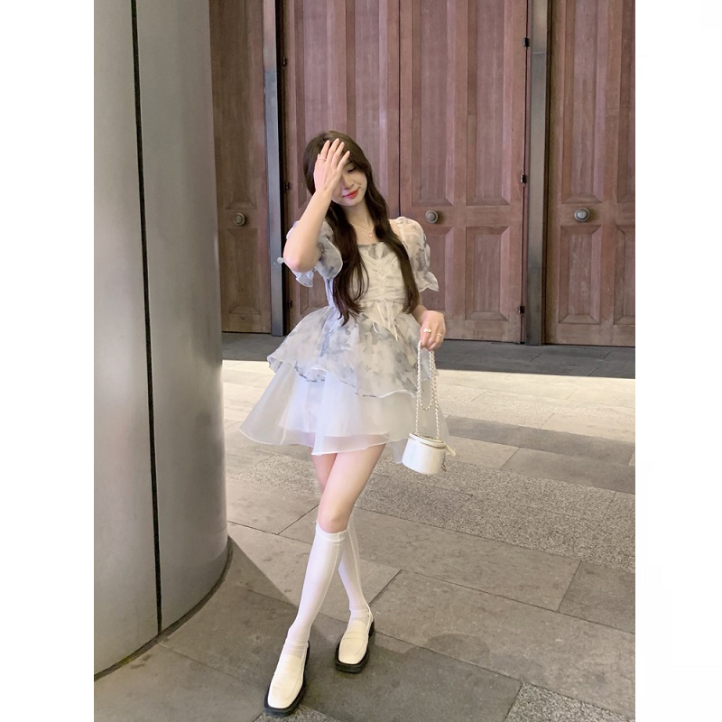 大码女装夏季新款氛围感系带欧根纱碎花蓬蓬连衣裙胖mm减龄仙女裙