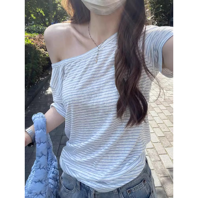 大码胖mm纯欲斜露肩条纹短袖T恤女夏季修身收腰甜辣妹一字肩上衣