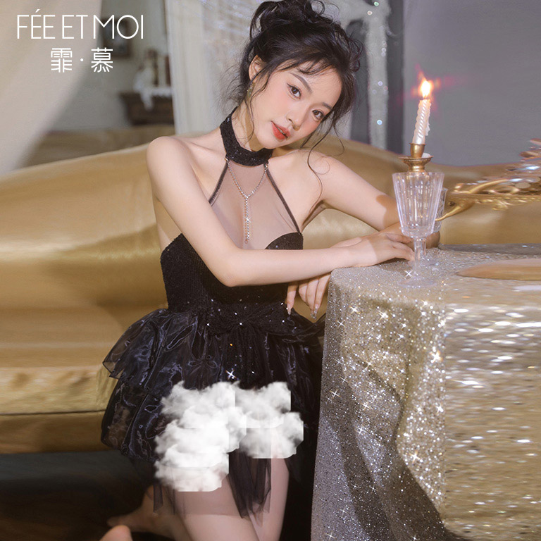 霏慕亮闪黑天鹅蓬蓬礼服裙睡裙女夏季网纱挂脖裙子性感抹胸蓬蓬裙