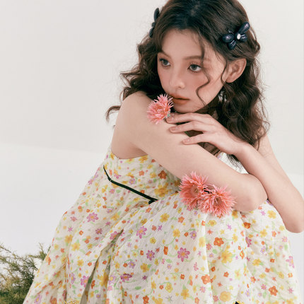 乐町设计感碎花吊带裙夏季碎花网纱短款少女鬼马轻盈蓬蓬连衣裙